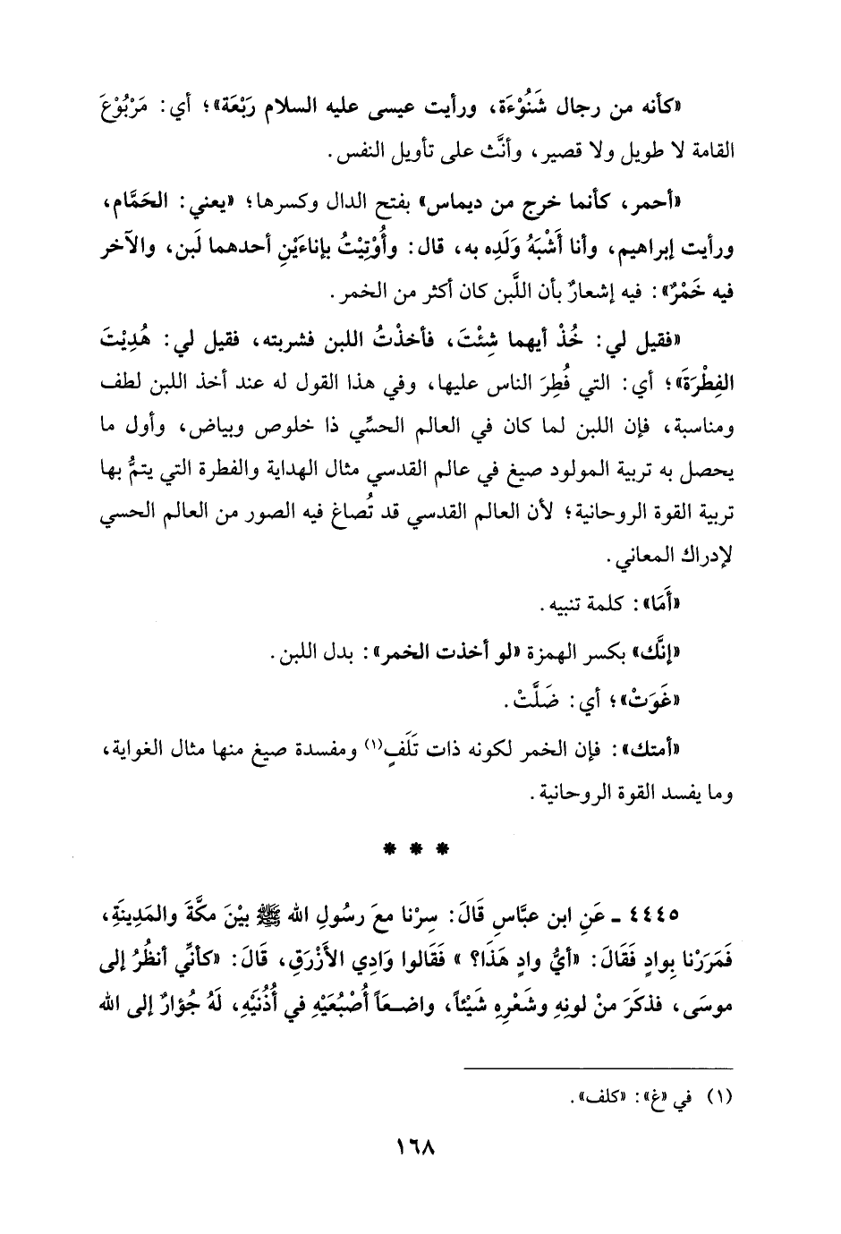 4445 - عَنِ ابن عبَّاسِ قَالَ: سِرْنا معَ رسُولِ الله - صلى الله عليه وسلم - بينَ مكَّةَ والمَدِينَةِ، فَمَرَزنا بِوادٍ فَقَالَ: "أيُّ وادٍ هذَا؟ " فَقَالوا وَادِي الأَزْرَقِ، قَالَ: "كأنّي أنظُرُ إلى موسَى، فذكرَ منْ لونهِ وشَعره شَيْئاً، واضعًا أُصبُعَيْهِ في أُذُنيهِ، لَهُ جُؤارٌ إلى الله