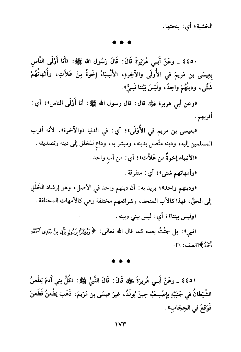4450 - وعَنْ أَبي هُرَيْرَةَ قَالَ: قَالَ رَسُول الله - صلى الله عليه وسلم -: "أَنا أَوْلَى النَّاسِ بِعِيسَى بن مَريمَ في الأولَى والآخِرةِ، الأَنْبيَاءُ إِخْوةٌ مِنْ عَلاَّت، وأُمهاتُهُمْ شَتَّى، ودينُهُم واحِدٌ، ولَيْسَ بَيْننا نبِيٌّ".