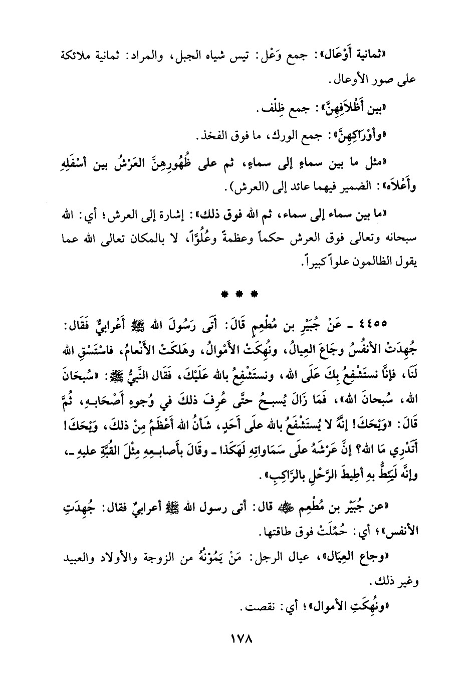 4455 - عَنْ جُبَيْرِ بن مُطْعِم قَالَ: أتى رَسُولَ الله - صلى الله عليه وسلم - أعرابي فَقَال: جُهِدَتْ الأنفُسُ وجَاعَ العِيالُ، ونُهِكَتْ الأَمْوالُ، وهلكَتْ الأَنْعامُ، فاسْتَسْقِ الله لَنَا، فإنَّا نستَشْفِعُ بِكَ عَلَى الله، ونستَشْفِعُ بالله عَلَيْكَ، فَقَال النَّبيُّ - صلى الله عليه وسلم -: "سُبحَانَ الله، سُبحانَ الله"، فَمَا زَالَ يُسبحُ حتَّى عُرِفَ ذلكَ في وُجوه أصحَابهِ، ثُمَّ قَالَ: "ويحَكَ! إنَّهُ لا يُستَشْفَعُ بالله علَى أَحَدٍ، شَأنُ الله أَعْظَمُ مِنْ ذلكَ، ويحَكَ! أتدرِي مَا الله؟ إنَّ عَرْشَهُ علَى سَمَاواتِهِ لهكَذا - وقَالَ بأَصابعِهِ مِثْلَ القُبَّةِ عليهِ -، وإنَّه لَيئطُّ بهِ أطِيطَ الرَّحْلِ بالرَّاكِب".