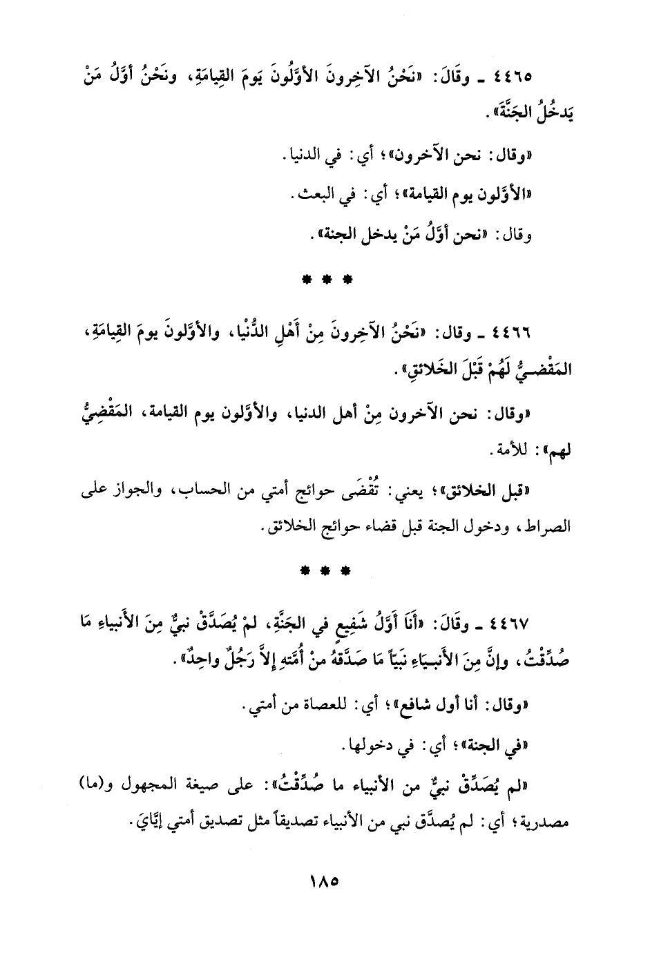 4466 - وقال: "نَحْنُ الآخِرونَ مِنْ أَهْلِ الدُّنْيا، والأوَّلونَ يومَ القِيامَةِ، المَقْضيُّ لَهُم قَبْلَ الخَلائقِ".