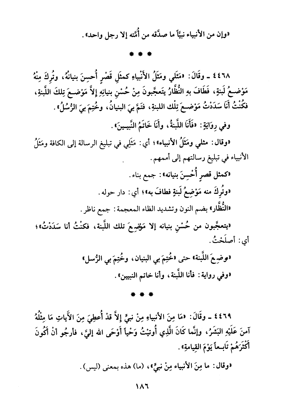 4468 - وقَالَ: "مَثَلي ومَثَلُ الأَنْبياءِ كمثَلِ قَصر أُحسِنَ بنيانُه، وتُرِكَ مِنْهُ مَوْضعُ لَبنةٍ، فَطَافَ بهِ النُّظَّارُ يتَعجَّبونَ مِنْ حُسْنِ بنيانِهِ إلَّا مَوْضعَ تِلكَ اللَّبنةِ، فكُنْتُ أَنَا سَدَدتُ مَوْضعَ تِلْك اللبنةِ، فتَمَّ بيَ البنيانُ، وخُتِمَ بيَ الرُّسُلُ".