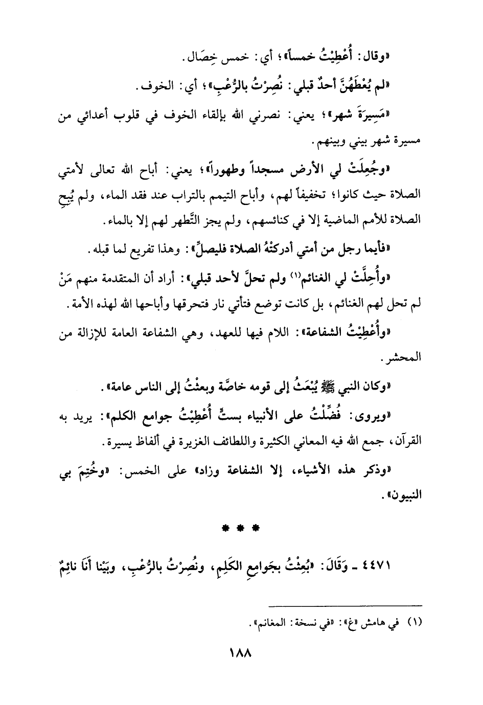 "ويروى: فُضِّلْتُ على الأنبياء بستٍّ أُعْطِيْتُ جوامع الكلم": يريد به القرآن، جمع الله فيه المعاني الكثيرة واللطائف الغزيرة في ألفاظ يسيرة.