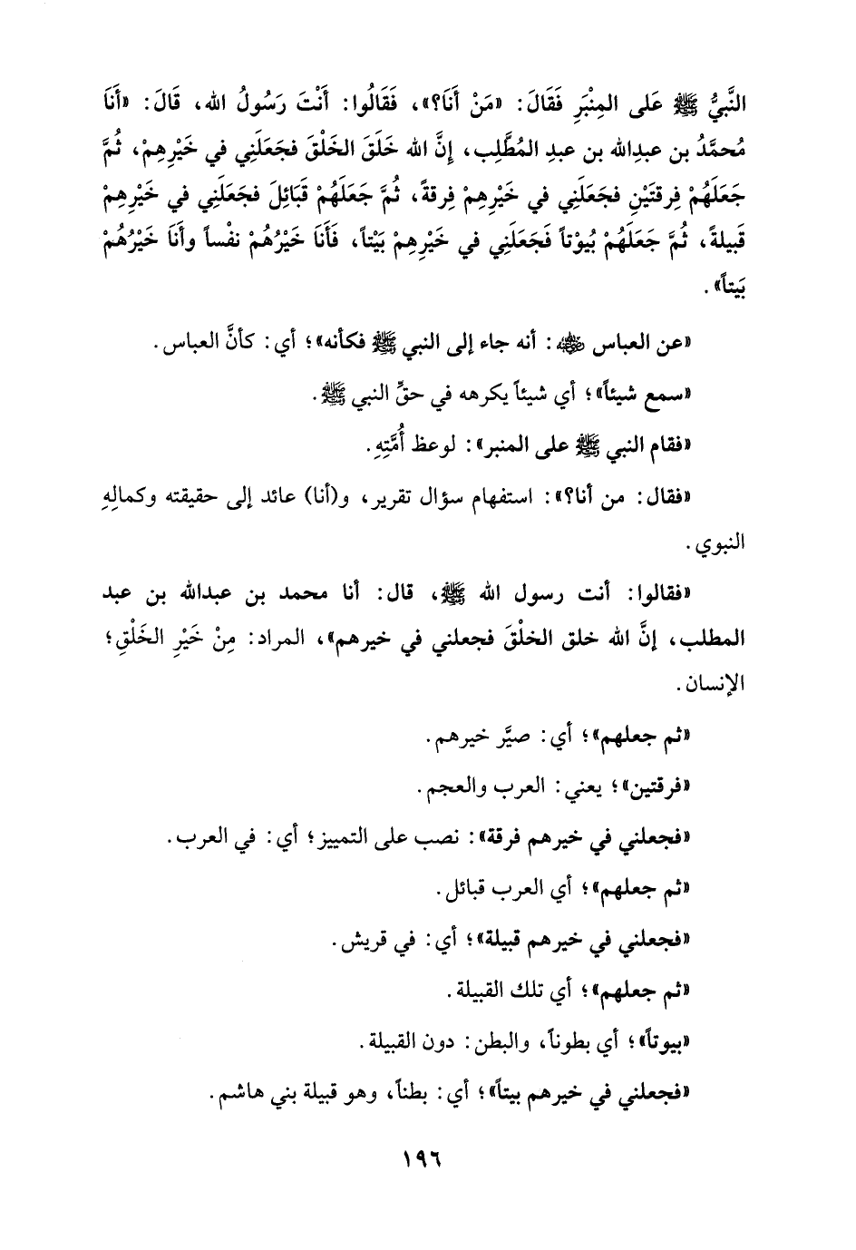 النَّبيُّ - صلى الله عليه وسلم - عَلى المِنْبَرِ فَقَالَ: "مَنْ أَنَا؟ "، فَقَالُوا: أَنْتَ رَسُولُ الله، قَالَ: "أَنَا مُحمَّدُ بن عبدِ الله بن عبدِ المُطلِب، إنَّ الله خَلَقَ الخَلْقَ فجَعَلَنِي في خَيْرِهِم، ثُمَّ جَعَلَهُم فِرقتَيْنِ فجَعَلَنِي في خَيْرِهِم فِرقةً، ثُمَّ جَعَلَهم قَبَائِلَ فجَعَلَنِي في خَيْرِهِم قَبيلة، ثُمَّ جَعَلَهُم بُيوْتاً فَجَعَلَنِي في خَيْرِهِمْ بَيْتاً، فَأَنَا خَيْرُهُم نفْساً وأَنَا خَيْرُهُم بَيتاً".