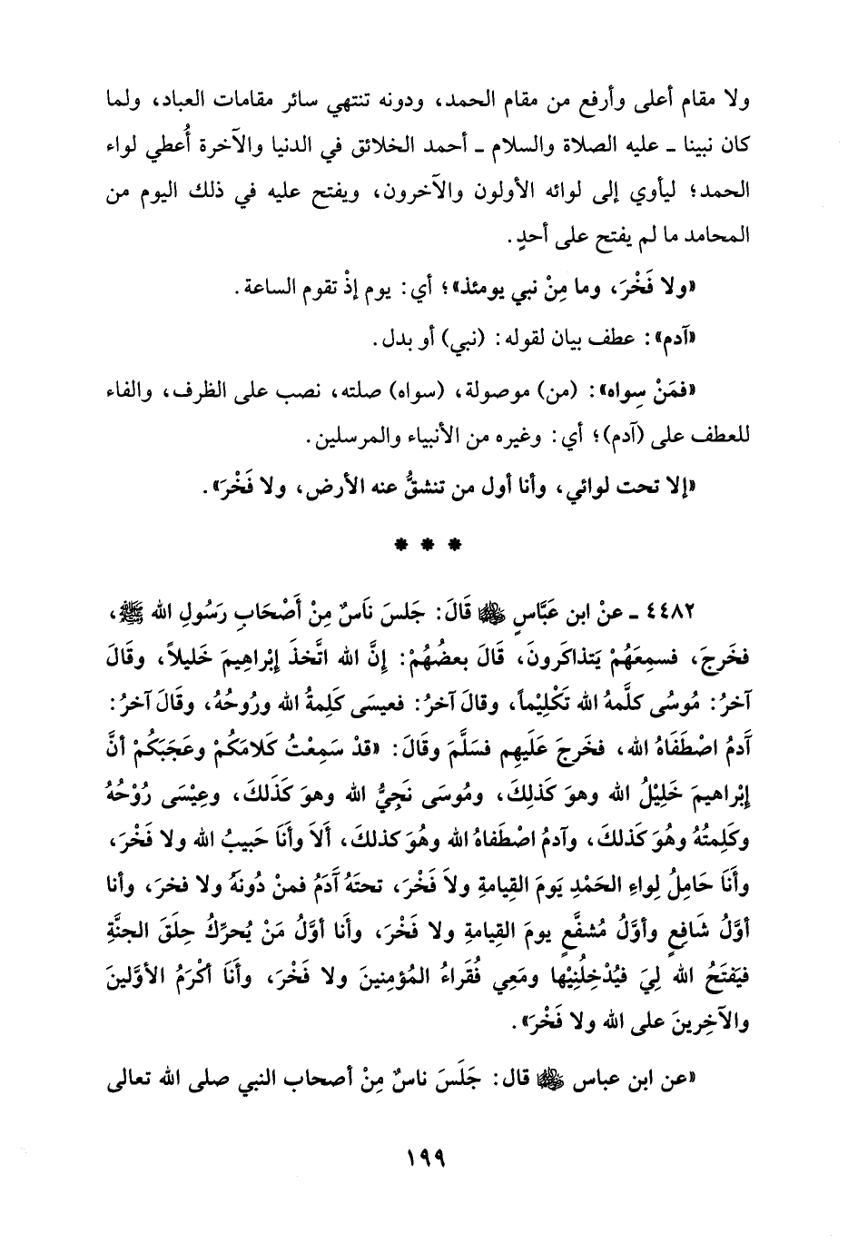 4482 - عنْ ابن عَبَّاسِ - رضي الله عنهما - قَالَ: جَلسَ نَاس مِنْ أَصحَابِ رَسُولِ الله - صلى الله عليه وسلم -، فخَرجَ، فسمِعَهُم يَتذاكَرونَ، قَالَ بعضُهُم: إِنَّ الله اتَّخذَ إبْراهِيمَ خَليلاً، وقَالَ آخرُ: مُوسُى كلَّمهُ الله تَكْلِيْما، وقالَ آخرُ: فعيسَى كَلِمةُ الله ورُوحُهُ، وقَالَ آخرُ: آدمُ اصْطَفَاهُ الله، فخَرجَ عَلَيهِم فسَلَّمَ وقَالَ: "قد سَمِعت كَلامَكم وعَجَبَكم أنَّ إِبْراهيمَ خَلِيْلُ الله وهوَ كَذلِكَ، ومُوسَى نَجيُّ الله وهوَ كَذَلكَ، وعِيْسَى رُوْحُهُ وكَلِمتهُ وهوَ كَذلكَ، وآدمُ اصطَفاهُ الله وهُوَ كذلكَ، أَلاَ وأَنَا حَبيبُ الله ولا فَخْرَ، وأَنَا حَامِلُ لِواء الحمدِ يَومَ القِيامةِ ولاَ فَخْرَ، تحتَهُ آدَمُ فمنْ دُونه ولا فخرَ، وأنا أوَّلُ شَافِعٍ وأوَلُ مُشفَّعٍ يومَ القِيامةِ ولا فَخْرَ، وأَنا أوَّلُ مَنْ يُحرِّكُ حِلَقَ الجنَّةِ فيَفتَحُ الله لِيَ فيُنخِلُنِبْها ومَعِي فُقَراءُ المُؤمِنينَ ولا فَخْرَ، وأَنَا أكْرَمُ الأوَّلينَ والآخِرينَ على الله ولا فَخْرَ".
