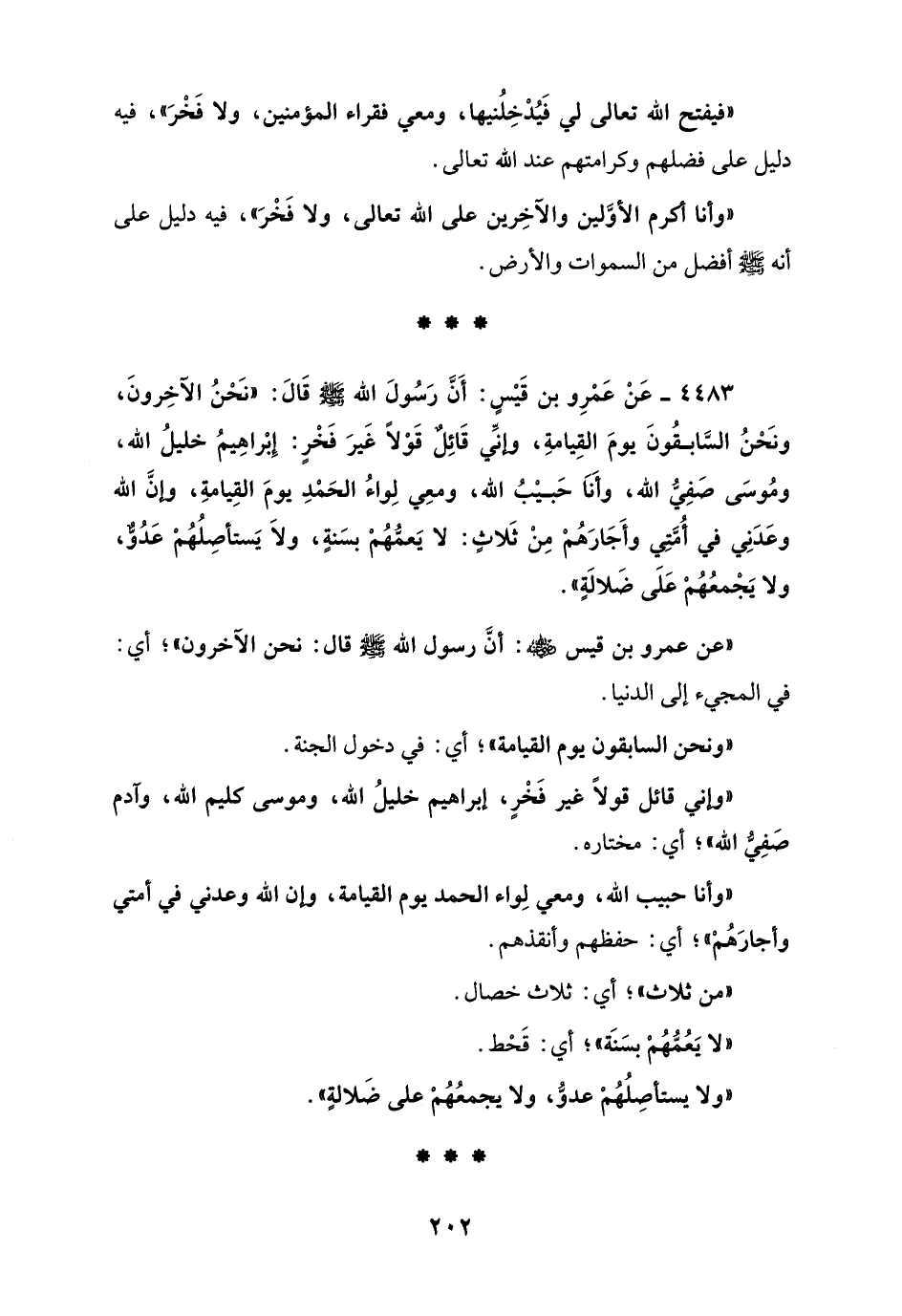 4483 - عَنْ عَمرِو بن قَيْسٍ: أَنَّ رَسُولَ الله - صلى الله عليه وسلم - قَالَ: "نَحْنُ الآخِرونَ، ونَحْنُ السَّابقُونَ يومَ القِيامةِ، وإنِّي قَائِلٌ قَوْلاً غيرَ فَخْر: إِبْراهِيمُ خليلُ الله، ومُوسَى صفِيُّ الله، وأَنَا حَبيْبُ الله، ومعِي لِواءُ الحمدِ يومَ القِيامةِ، وإنَّ الله وعَدَنِي في أُمَّتِي وأَجَارَهم مِنْ ثَلاثٍ: لا يَعمُّهم بسَنةٍ، ولاَ يَستأصِلُهم عَدُوٌّ، ولا يَجْمعُهُم عَلَى ضَلالَةٍ".