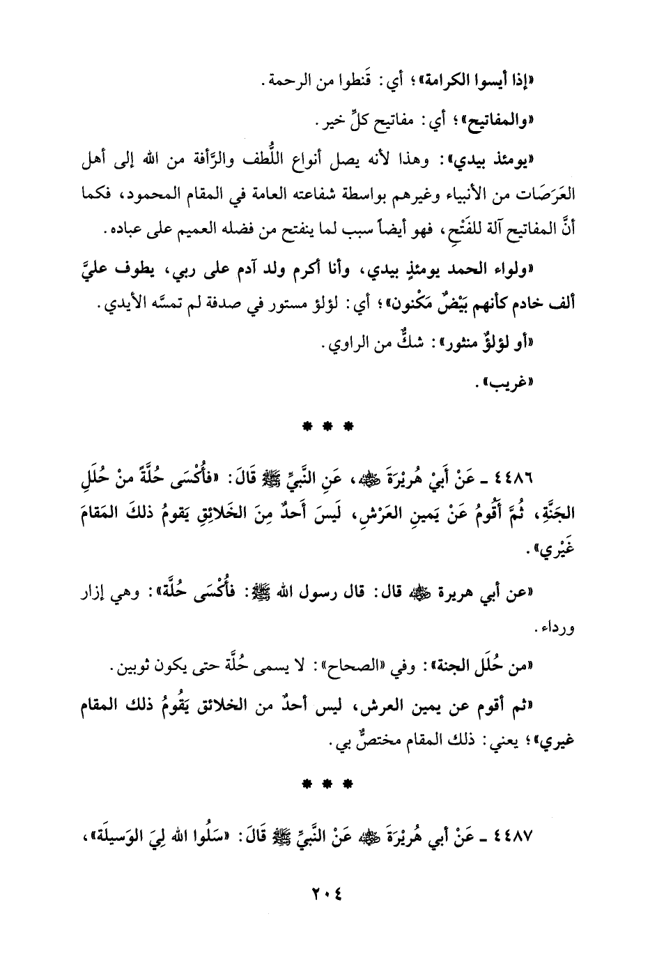 4486 - عَنْ أَبي هُريْرَة - رضي الله عنه -، عَنِ النَّبيِّ - صلى الله عليه وسلم - قَالَ: "فأُكسَى حُلَّةً منْ حُلَلِ الجَنَّةِ، ثُمَّ أقومُ عَنْ يَمينِ العَرْشِ، لَيسَ أَحدٌ مِنَ الخَلائِقِ يَقومُ ذلكَ المَقامَ غَيْري".
