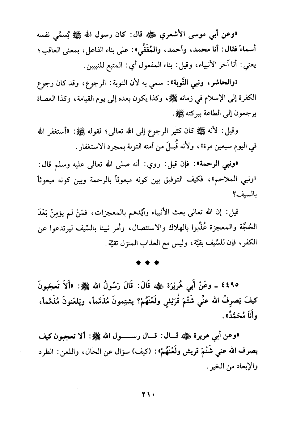"وعن أبي موسى الأشعري - رضي الله عنه - قال: كان رسول الله - صلى الله عليه وسلم - يُسمِّي نفسه أسماءً فقال: أنا محمد، وأحمد، والمُقَفِّي": على بناء الفاعل، بمعنى العاقب؛ يعني: أنا آخر الأنبياء، وقيل: بناء المفعول أي: المتبع للنبيين.