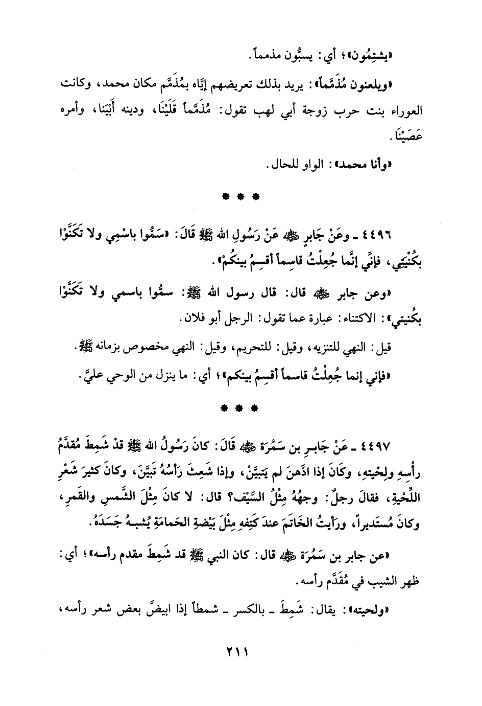 4497 - عَنْ جَابرِ بن سَمُرَة - رضي الله عنه - قَالَ: كانَ رَسُولُ الله - صلى الله عليه وسلم - قد شَمِطَ مُقدَّمُ رأْسِهِ ولِحيتهِ، وكَانَ إذا ادَّهنَ لم يَتَبيَّنْ، وإذا شَعِثَ رَأسُهُ تَبيَّنَ، وكانَ كثيرَ شَعرِ اللِّحيةِ، فقالَ رجل: وجهُهُ مِثْلُ السَّيْف؟ قال: لا كانَ مِثْلَ الشَّمسِ والقَمرِ، وكانَ مُستَديراً، ورَأيتُ الخَاتَمَ عندَ كتِفهِ مِثْلَ بَيْضةِ الحَمامَةِ يُشبهُ جَسَدَهُ.