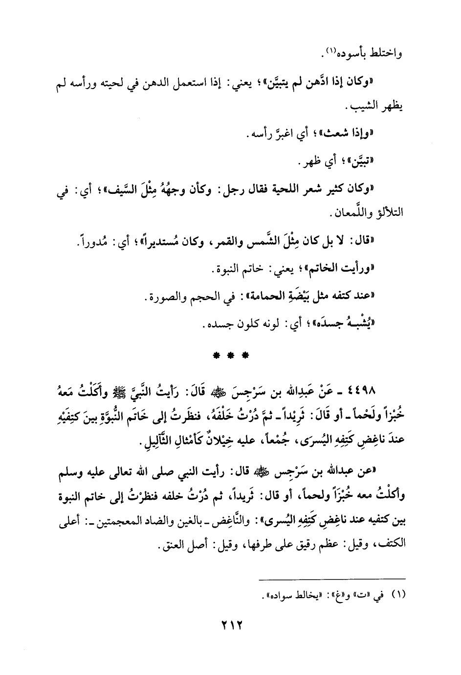 "عن عبد الله بن سرْجِس - رضي الله عنه - قال: رأيت النبي صلى الله تعالى عليه وسلم وأكلْتُ معه خُبْزًا ولحماً، أو قال: ثَريداً، ثم دُرْتُ خلفه فنظرْتُ إلى خاتم النبوة بين كتفيه عند ناغِضِ كَتِفِهِ اليُسرى": والنَّاغِض - بالغين والضاد المعجمتين -: أعلى الكتف، وقيل: عظم رقيق على طرفها، وقيل: أصل العنق. ¬__________