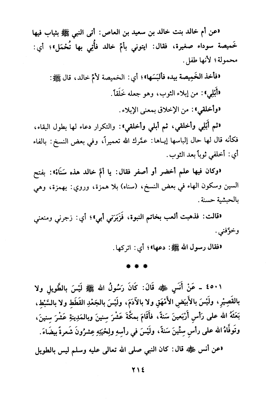"عن أنس - رضي الله عنه - قال: كان النبي صلى الله تعالى عليه وسلم ليس بالطويل