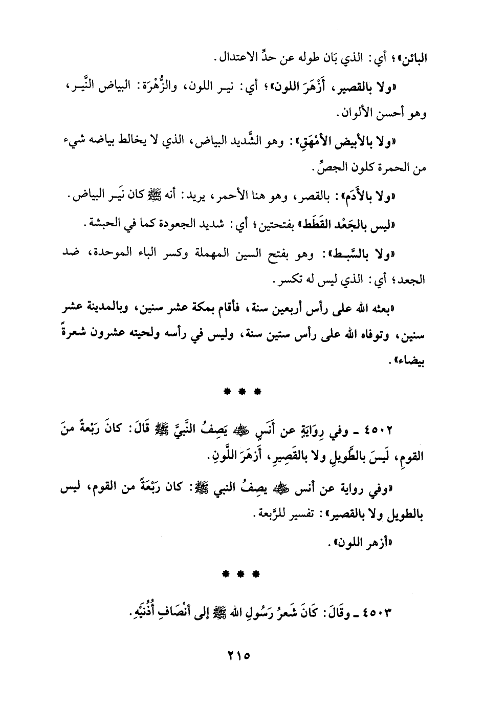 4502 - وفي رِوَايَةٍ عن أَنسٍ - رضي الله عنه - يَصِفُ النَّبي - صلى الله عليه وسلم - قَالَ: كانَ رَبعةً منَ القومِ، لَيسَ بالطَّويلِ ولا بالقَصِيرِ، أَزهرَ اللَّونِ.