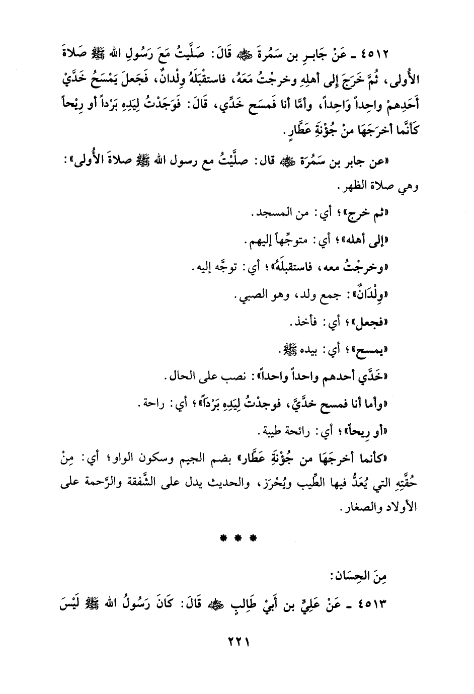 4512 - عَنْ جَابرِ بن سَمُرةَ - رضي الله عنه - قَالَ: صَلَّيتُ مَعَ رَسُولِ الله - صلى الله عليه وسلم - صَلاةَ الأُولى، ثُمَّ خَرَجَ إِلى أهلِهِ وخرجْتُ مَعَهُ، فاستقْبَلَهُ وِلْدانٌ، فَجَعلَ يَمْسَحُ خَدَّيْ أَحَدِهمْ واحِداً وَاحِداً، وأمَّا أنا فَمسَح خَدِّي، قَالَ: فَوَجَدْتُ لِيَدِهِ بَرْداً أو رِيْحاً كَأنَّما أخرَجَهَا منْ جُؤْنَةِ عَطَّارٍ.