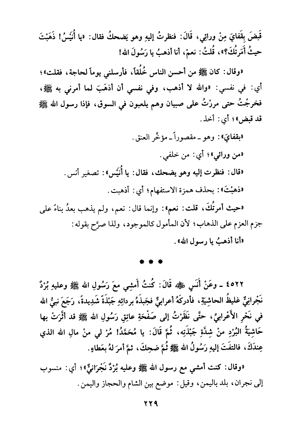 4522 - وعَنْ أَنسٍ - رضي الله عنه - قَالَ: كُنتُ أَمشِي معَ رَسُولِ الله - صلى الله عليه وسلم - وعليهِ بُرْدٌ نَجْرانِيٌّ غليظُ الحاشِيَةِ، فأدركَهُ أعرابيٌّ فجَبذَهُ بردائِهِ جَبْذَةً شَدِيدةً، رَجَعَ نبيُّ الله في نَحْرِ الأَعْرابيِّ، حتَّى نَظَرْتُ إلى صَفْحَةِ عاتِقِ رَسُولِ الله - صلى الله عليه وسلم - قد أثَّرَتْ بها حَاشِيَةُ البُرْدِ منْ شِدَّةِ جَبْذَتِه، ثُمَّ قَالَ: يا مُحَمَّدُ! مُرْ لي منْ مالِ الله الذي عِندَكَ، فالتفَتَ إليهِ رَسُولُ الله - صلى الله عليه وسلم - ثُمَّ ضحِكَ، ثمَّ أمرَ لهُ بعَطاءٍ.