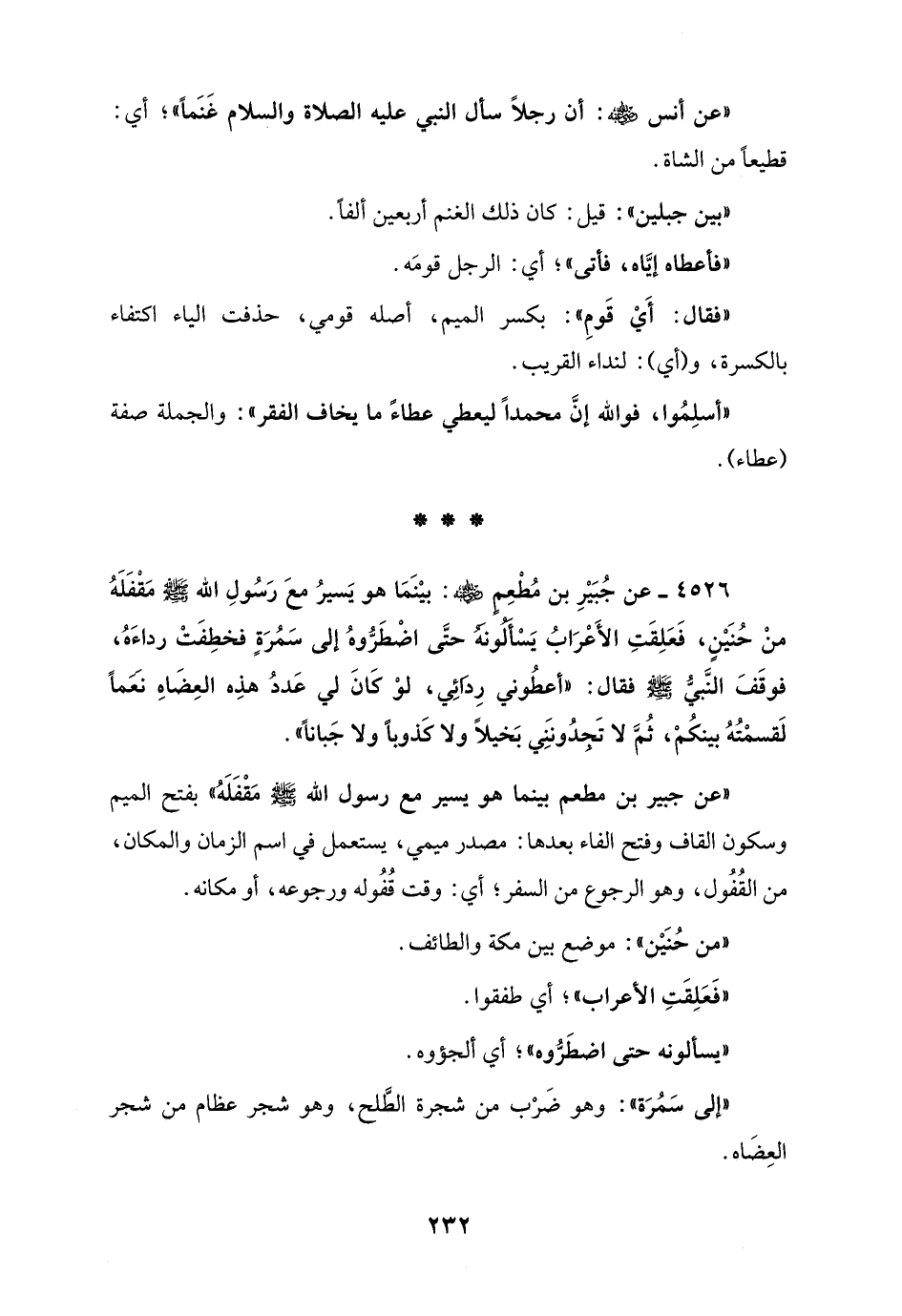 4526 - عن جُبَيْرِ بن مُطْعِمٍ - رضي الله عنه -: بيْنَمَا هو يَسيرُ معَ رَسُولِ الله - صلى الله عليه وسلم - مَقْفَلَهُ منْ حُنَيْنٍ، فَعَلِقَتِ الأَعْرَابُ يَسْأَلُونَهُ حتَّى اضْطَرُّوهُ إلى سَمُرَةٍ فخطِفَتْ رداءَهُ، فوقَفَ النَّبيُّ - صلى الله عليه وسلم - فقال: "أعطُوني رِدَائِي، لوْ كَانَ لي عَددُ هذِه العِضَاهِ نَعَماً لَقسمْتُهُ بينكُمْ، ثُمَّ لا تَجِدُونَنِي بَخيلاً ولا كَذوباً ولا جَباناً".