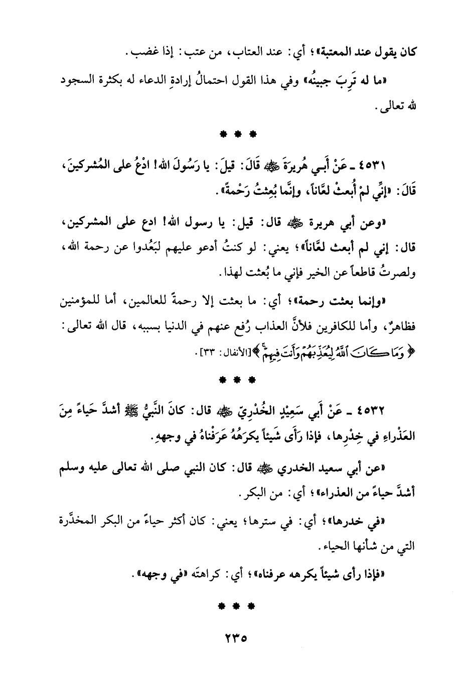 4532 - عَنْ أَبي سَعِيْدٍ الخُدْرِيّ - رضي الله عنه - قال: كانَ النَّبيّ - صلى الله عليه وسلم - أشدَّ حَياءً مِنَ العَذْراءِ في خِدْرِها، فإذا رَأَى شَيئاً يكرَهُهُ عَرَفْناهُ في وجههِ.