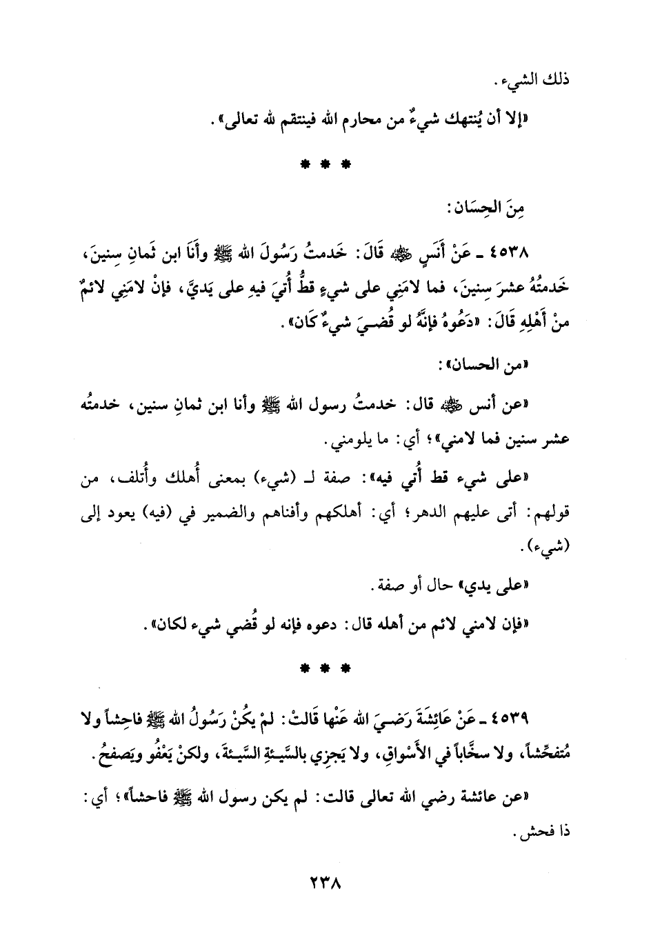 " عن أنس - رضي الله عنه - قال: خدمتُ رسول الله - صلى الله عليه وسلم - وأنا ابن ثمانِ سنين، خدمتُه عشر سنين فما لامني"؛ أي: ما يلومني.