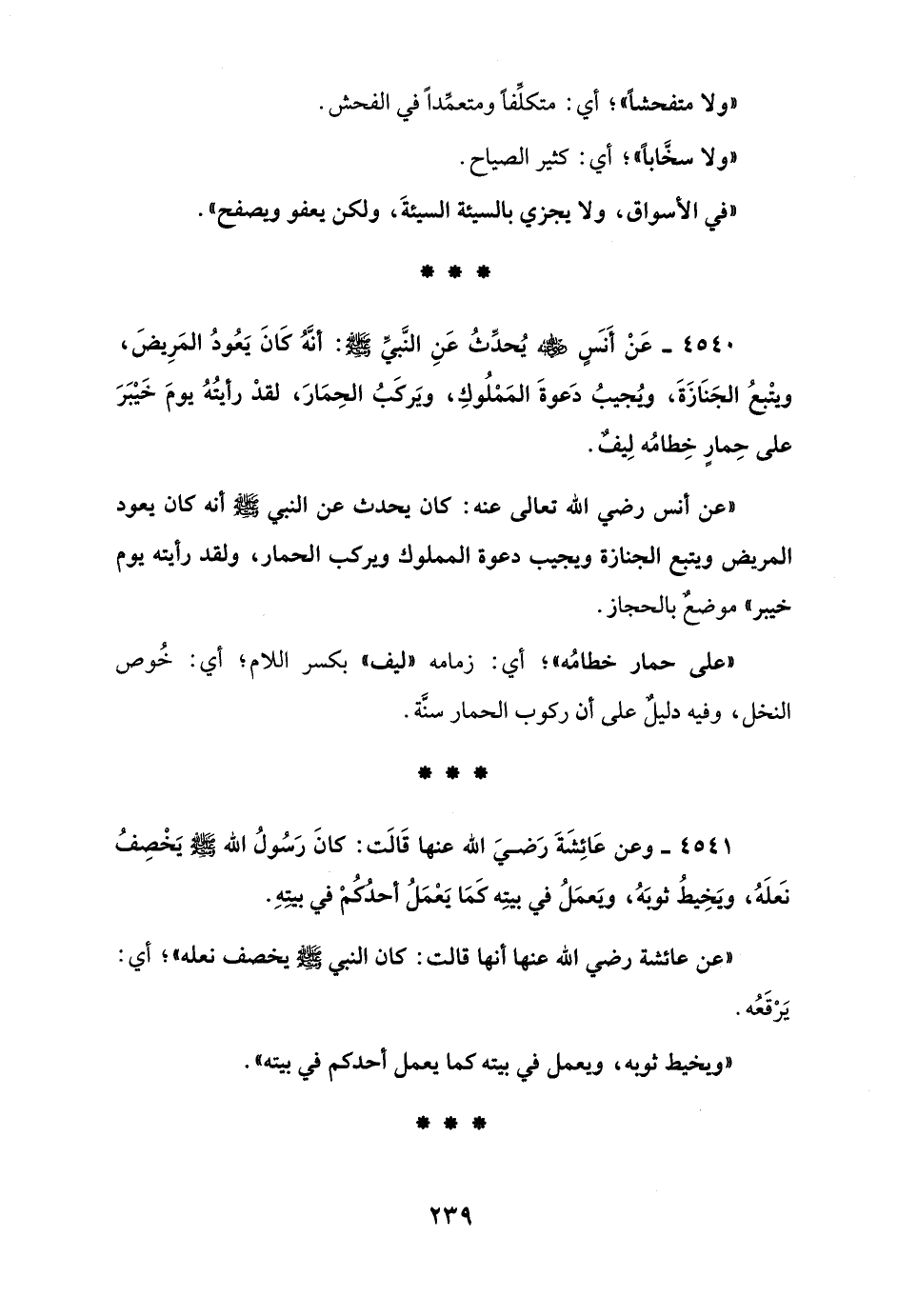 4540 - عَنْ أَنَسٍ - رضي الله عنه - يُحدِّثُ عَنِ النَّبيِّ - صلى الله عليه وسلم -: أنَّهُ كَانَ يَعُودُ المَرِيضَ، ويتْبعُ الجَنَازَةَ، ويُجيبُ دَعوةَ المَمْلُوكِ، ويَركَبُ الحِمَارَ، لقدْ رأيتُهُ يومَ خَيْبَرَ على حِمارٍ خِطامُه لِيفٌ.