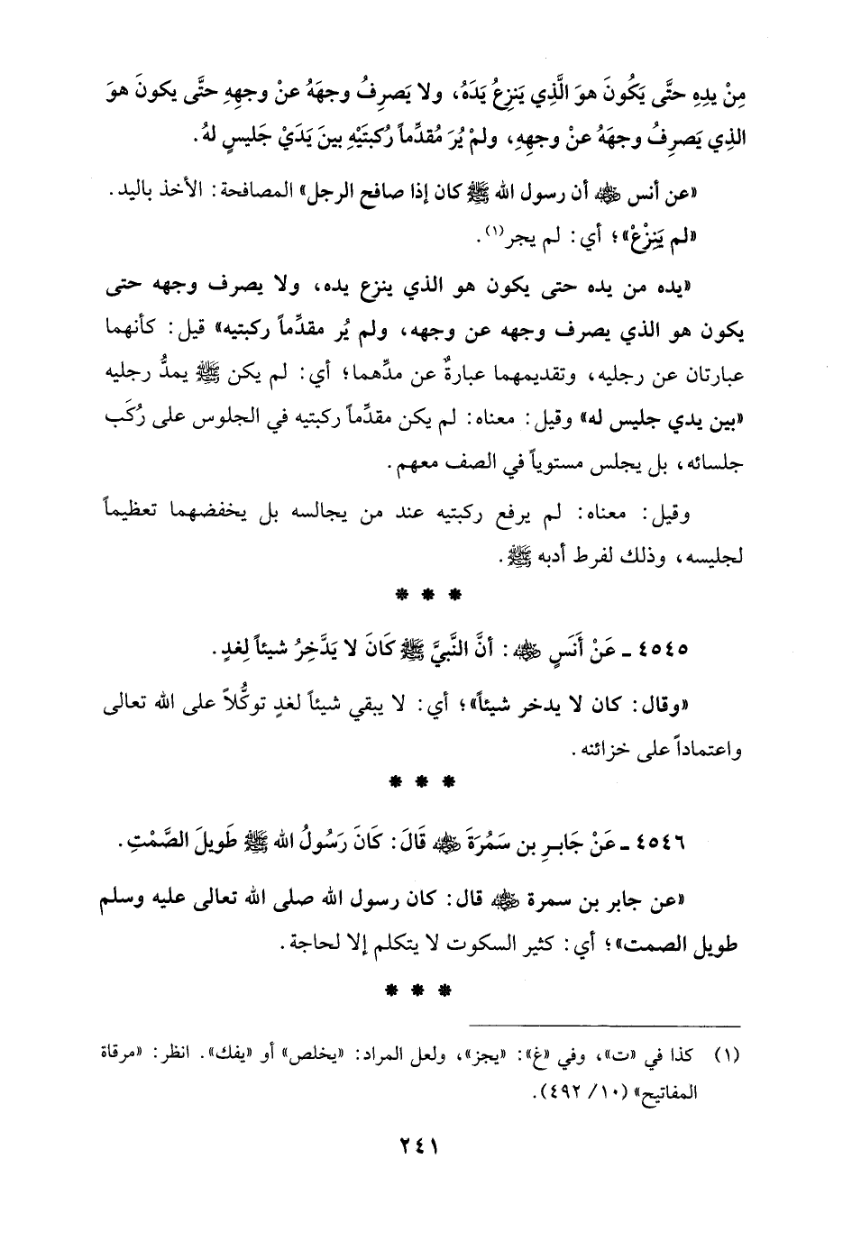 مِنْ يدِهِ حتَّى يَكُونَ هوَ الَّذِي يَنزِعُ يَدَهُ، ولا يَصرِفُ وجهَهُ عنْ وجهِهِ حتَّى يكونَ هوَ الذِي يَصرِفُ وجهَهُ عنْ وجهِهِ، ولمْ يُرَ مُقدِّماً رُكبتَيْهِ بينَ يَدَيْ جَليسٍ لهُ.