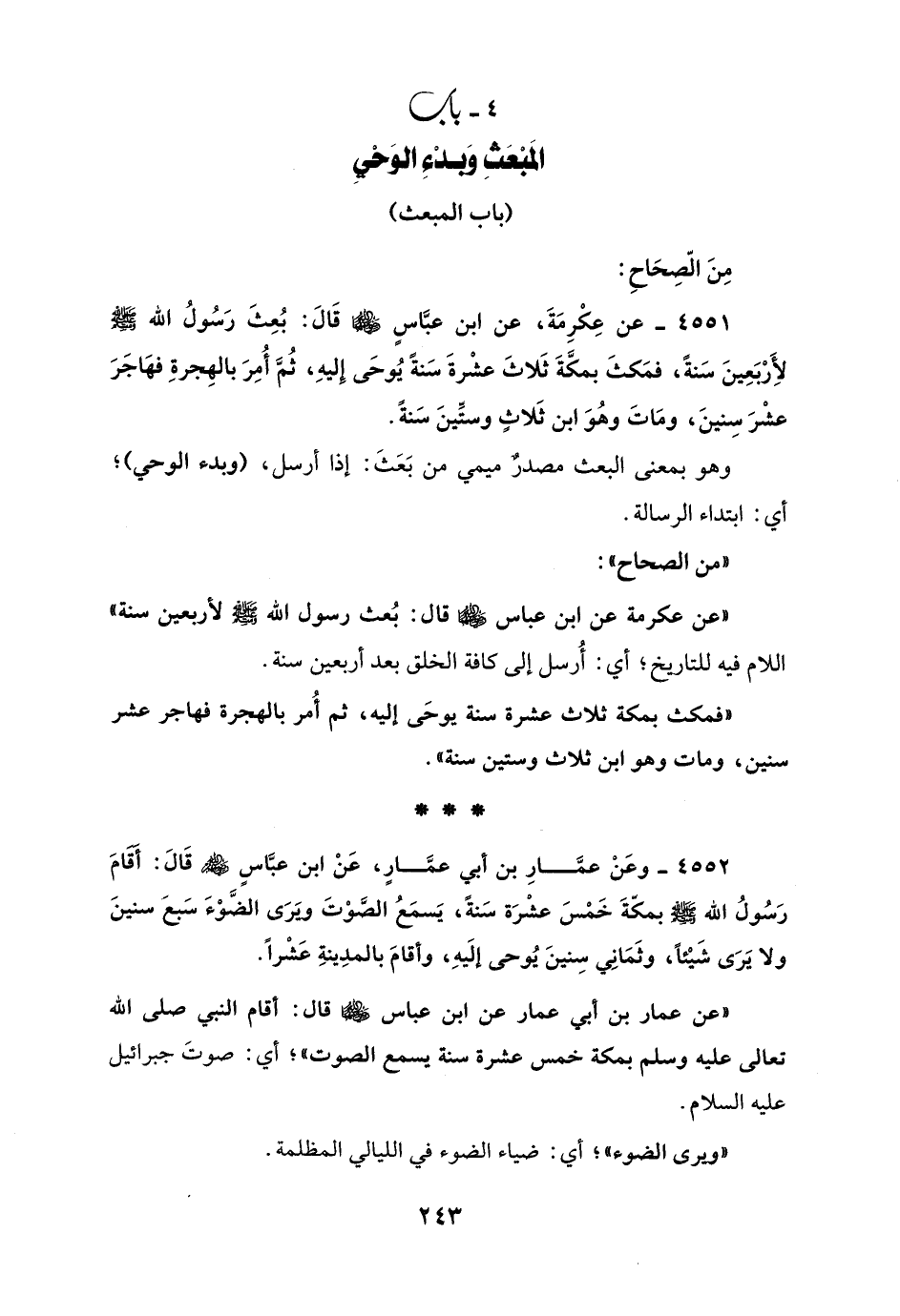 4552 - وعَنْ عمَّارِ بن أبي عمَّارٍ، عَنْ ابن عبَّاسٍ - رضي الله عنهما - قَالَ: أَقَامَ رَسُولُ الله - صلى الله عليه وسلم - بمكّةَ خَمْسَ عشْرَة سَنةً، يَسمَعُ الصَّوْتَ ويَرَى الضَّوْءَ سَبعَ سنينَ ولا يَرَى شَيْئاً، وثَمَانِي سِنينَ يُوحى إلَيهِ، وأقامَ بالمدِينةِ عَشْراً.