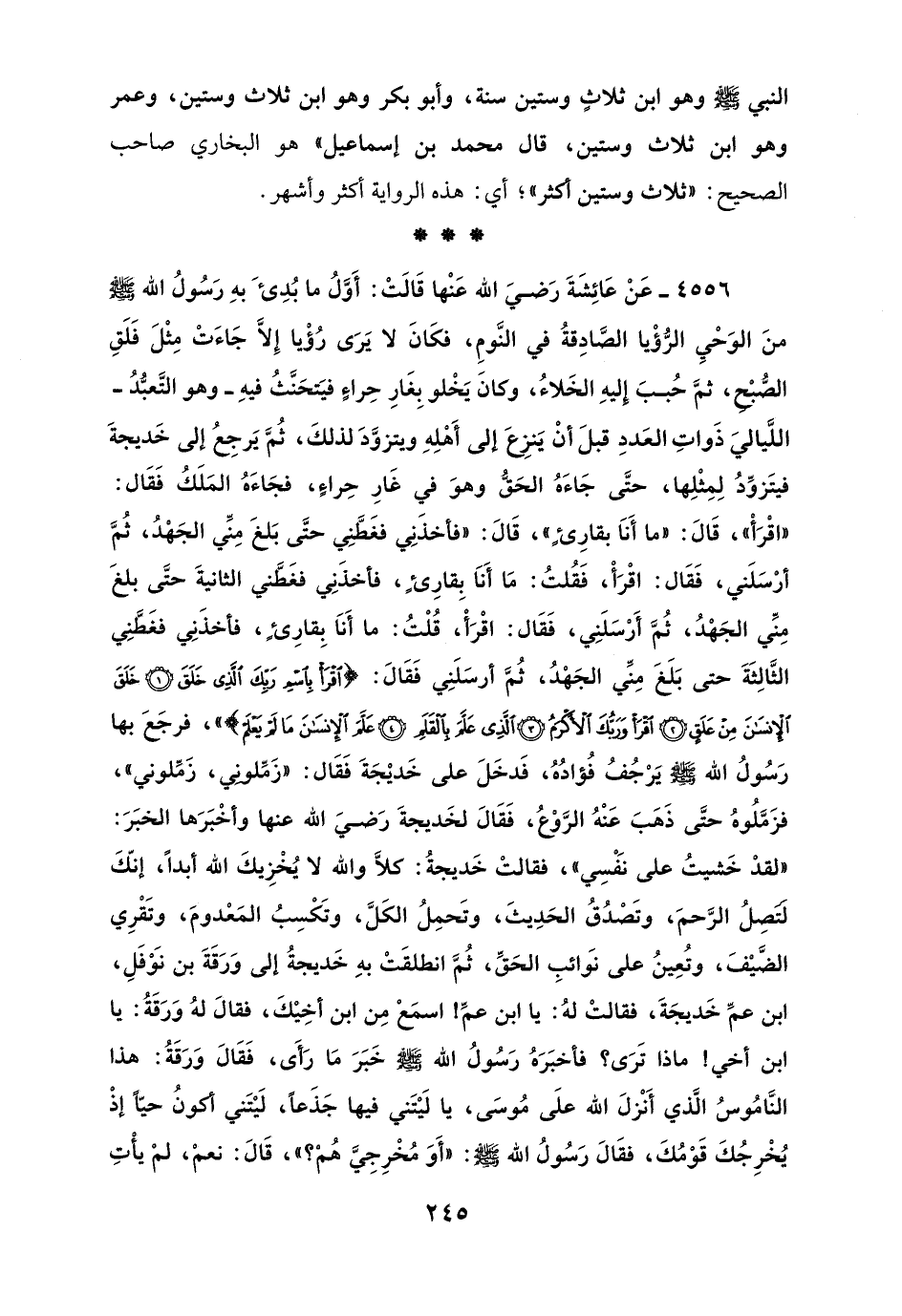 4556 - عَنْ عَائِشَةَ رَضيَ الله عَنْها قَالَتْ: أَوَّلُ ما بُدِئَ بهِ رَسُولُ الله - صلى الله عليه وسلم - منَ الوَحْيِ الرُّؤْيا الصَّادِقةُ في النَّومِ، فكَانَ لا يَرَى رُؤْيا إِلَّا جَاءَتْ مِثْلَ فَلَقِ الصُّبْحِ، ثمَّ حُببَ إِليهِ الخَلاءُ، وكان يَخْلو بِغَارِ حِراءٍ فيَتحَنَّثُ فيهِ - وهو التَّعبُّدُ - اللَّياليَ ذَواتِ العَددِ قبلَ أنْ يَنزِعَ إلى أَهْلِهِ ويتزوَّدَ لذلكَ، ثُمَّ يَرجِعُ إلى خَديجةَ فيتَزوِّدُ لِمِثْلِها، حتَّى جَاءَهُ الحَقُّ وهوَ في غَارِ حِراءٍ، فجَاءَهُ المَلَكُ فَقَال: "اقْرَأْ"، قَالَ: "ما أَنَا بِقارِئٍ"، قَالَ: "فأخذَنِي فغَطَّنِي حتَّى بَلغَ مِنِّي الجَهْدُ، ثُمَّ أرْسَلَني، فَقَال: اقْرَأْ، فَقُلتُ: مَا أَنَا بِقارِئٍ، فأخذَنِي فغَطَّني الثانيةَ حتَّى بلغَ مِنِّي الجَهْدُ، ثُمَّ أَرْسَلَنِي، فَقَال: اقْرَأَ، قُلْتُ: ما أَنَا بِقارِئٍ, فأخذَنِي فغَطَّنِي الثَّالِثَةَ حتى بَلَغَ مِنِّي الجَهْدُ، ثُمَّ أرسَلَنِي فَقَالَ: {اقْرَأْ بِاسْمِ رَبِّكَ الَّذِي خَلَقَ (1) خَلَقَ الْإِنْسَانَ مِنْ عَلَقٍ (2) اقْرَأْ وَرَبُّكَ الْأَكْرَمُ (3) الَّذِي عَلَّمَ بِالْقَلَمِ (4) عَلَّمَ الْإِنْسَانَ مَا لَمْ يَعْلَمْ} "، فرجَعَ بها رَسُولُ الله - صلى الله عليه وسلم - يَرْجُفُ فُؤادُهُ، فَدخَلَ على خَديْجَةَ فَقَال: "زَمِّلونِي، زَمِّلوني"، فزَمَّلُوهُ حتَّى ذَهَبَ عَنْهُ الرَّوْعُ، فَقَالَ لخَديجةَ رَضيَ الله عنها وأخْبَرَها الخبَرَ: "لقدْ خَشيتُ على نَفْسِي"، فقالتْ خَديجةُ: كلَّا والله لا يُخْزِيكَ الله أبداً، إنّكَ لَتَصِلُ الرَّحمَ، وتَصْدُقُ الحَدِيثَ، وتَحمِلُ الكَلَّ، وتَكْسِبُ المَعْدومَ، وتَقْرِي الضَّيْفَ، وتُعِينُ على نوَائبِ الحَقِّ، ثُمَّ انطلقَتْ بهِ خَديجةُ إلى وَرَقَةَ بن نَوْفَلِ، ابن عمِّ خَديجَةَ، فقالتْ لهُ: يا ابن عمِّ! اسمَعْ مِن ابن أخِيْكَ، فقالَ لهُ وَرَقَةُ: يا ابن أخي! ماذا تَرَى؛ فأخبَرَهُ رَسُولُ الله - صلى الله عليه وسلم - خَبَرَ مَا رَأَى، فَقَالَ وَرَقَةُ: هذا النَّامُوسُ الَّذي أَنْزلَ الله علَى مُوسَى، يا لَيْتَني فيها جَذَعاً، لَيْتَني أكونُ حيًّا إذْ يُخْرِجُكَ قَوْمُكَ، فقَالَ رَسُولُ الله - صلى الله عليه وسلم -: "أَوَ مُخْرِجِيَّ هُمْ؟ "، قَالَ: نعمْ، لمْ يأْتِ
