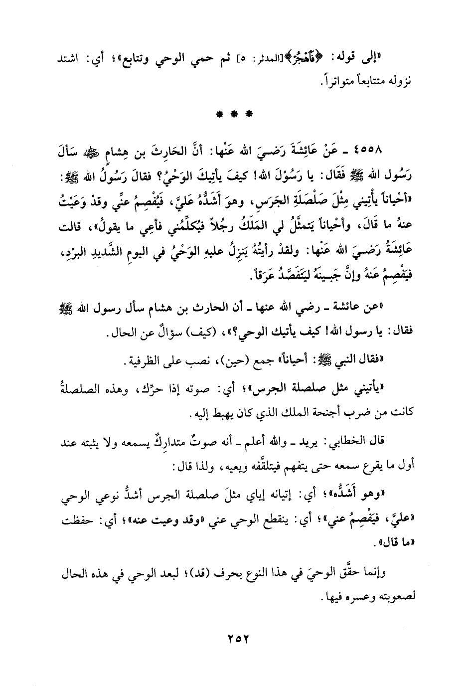 4558 - عَنْ عَائِشَةَ رَضيَ الله عَنْها: أنَّ الحَارِثَ بن هِشامٍ - رضي الله عنه - سَألَ رَسُول الله - صلى الله عليه وسلم - فَقَال: يا رَسُوْلَ الله! كيفَ يأتِيكَ الوَحْيُ؟ فقالَ رَسُولُ الله - صلى الله عليه وسلم -: "أحْياناً يأْتِيني مِثْلَ صَلْصَلَةِ الجَرَسِ، وهوَ أَشَدُّهُ عَليَّ، فَيُفْصِمُ عنِّي وقدْ وَعَيْتُ عنهُ ما قَالَ، وأحْياناً يَتمثَّلُ لي المَلَكُ رجُلاً فيُكلِّمُني فأعِي ما يقولُ"، قالت عَائِشَةُ رَضيَ الله عَنْها: ولقدْ رأيتُهُ يَنزِلُ عليهِ الوَحْيُ في اليومِ الشَّديدِ البرْدِ، فيَفْصِمُ عَنهُ وإنَّ جَبينَهُ ليَتَفَصَّدُ عَرَقاً.