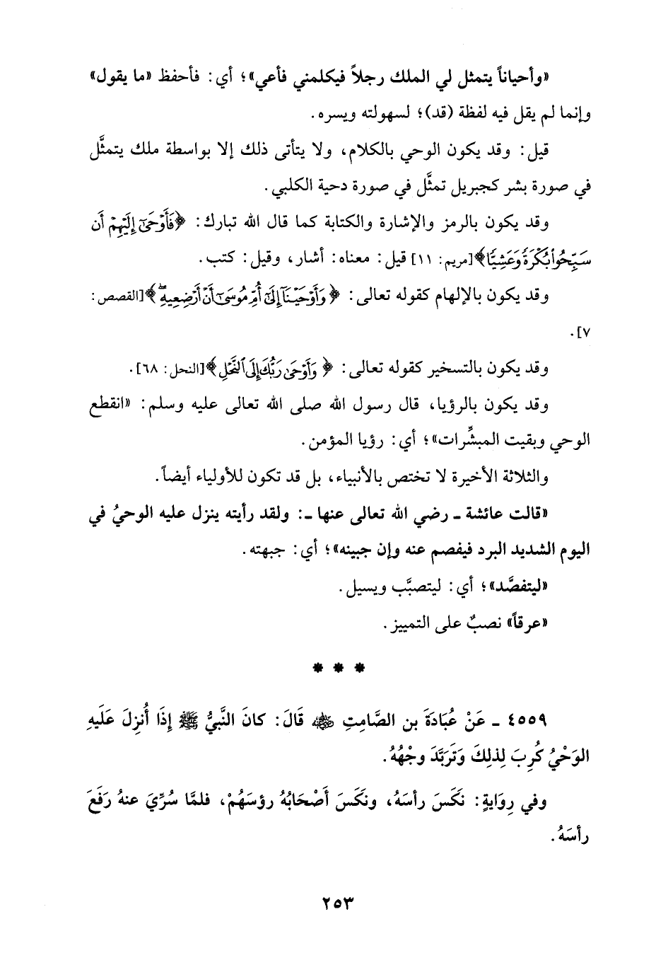 4559 - عَنْ عُبَادَةَ بن الصَّامِتِ - رضي الله عنه - قَالَ: كانَ النَّبيّ - صلى الله عليه وسلم - إِذَا أُنزِلَ عَلَيهِ الوَحْيُ كُرِبَ لِذلِكَ وَتَرَبَّدَ وجْهُهُ.