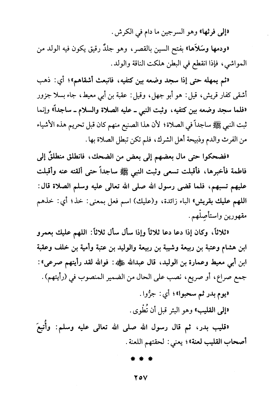 "ثلاثاً، وكان إذا دعا دعا ثلاثاً وإذا سأل سأل ثلاثاً: اللهم عليك بعمرو ابن هشام وعتبة بن ربيعة وشيبة بن ربيعة والوليد بن عتبة وأمية بن خلف وعقبة ابن أبي معيط وعمارة بن الوليد، قال عبد الله - رضي الله عنه -: فوالله لقد رأيتهم صرعى": جمع صراع، أو صريع، نصب على الحال من الضمير المنصوب في (رأيتهم).