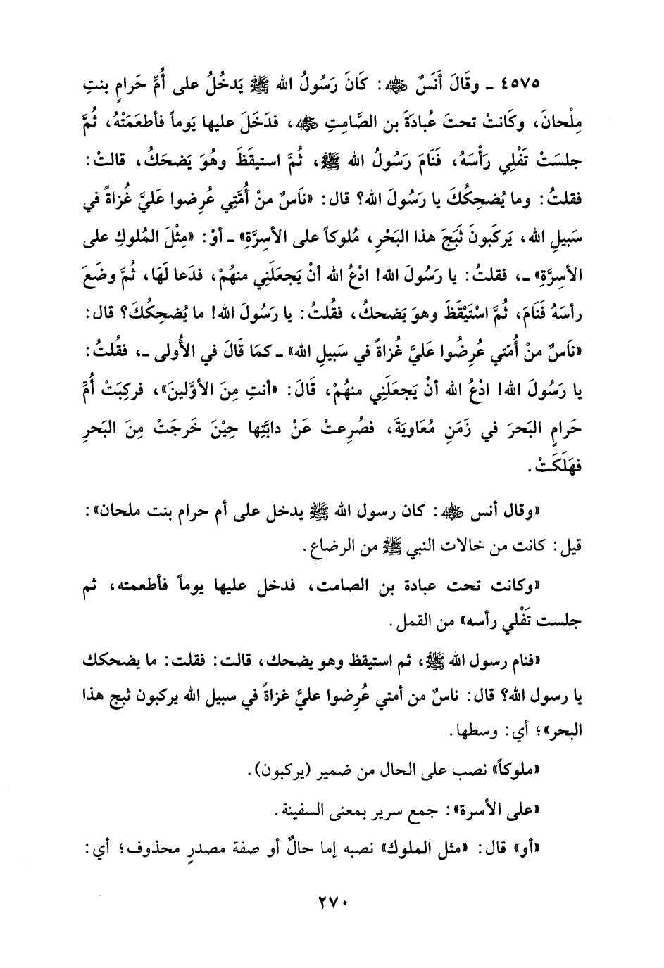 4575 - وقَالَ أَنسٌ - رضي الله عنه -: كَانَ رَسُولُ الله - صلى الله عليه وسلم - يَدخُلُ على أُمِّ حَرامٍ بنتِ مِلْحانَ، وكَانتْ تحتَ عُبادَةَ بت الصَّامِتِ - رضي الله عنه -، فدَخَلَ عليها يَوماً فأطعَمَتْهُ، ثُمَّ جلسَتْ تَفْلِي رَأْسَهُ، فَنَامَ رَسُولُ الله - صلى الله عليه وسلم -، ثُمَّ استيقَظَ وهُوَ يَضحَكُ، قالتْ: فقلتُ: وما يُضحِكُكَ يا رَسُولَ الله؛ قال: "نَاسٌ منْ أُمَّتِي عُرِضوا عَليَّ غُزاةً في سَبيلِ الله، يَركَبونَ ثَبَجَ هذا البَحْرِ، مُلوكاً على الأسِرَّةِ" - أوْ: "مِثْلَ المُلوكِ على الأسِرَّةِ" -، فقلتُ: يا رَسُولَ الله! ادْعُ الله أنْ يَجعَلَنِي منهُمْ، فدَعا لَهَا، ثُمَّ وضَعَ رأسَهُ فَنَامَ، ثُمَّ اسْتَيْقَظَ وهوَ يَضحكُ، فقُلتُ: يا رَسُولَ الله! ما يُضحِكُكَ؟ قال: "نَاسٌ منْ أُمّتي عُرِضُوا عَليَّ غُزاةً في سَبيلِ الله" - كمَا قَالَ في الأُولى -، فقُلتُ: يا رَسُولَ الله! ادْعُ الله أنْ يَجعَلَنِي منهُمْ، قَالَ: "أنتِ مِنَ الأوَّلينَ"، فركِبَتْ أُمِّ حَرامٍ البَحرَ في زَمَنِ مُعَاويَةَ، فصُرِعتْ عَنْ دابَّتِها حِيْنَ خَرجَتْ مِنَ البَحرِ فهَلَكَت.