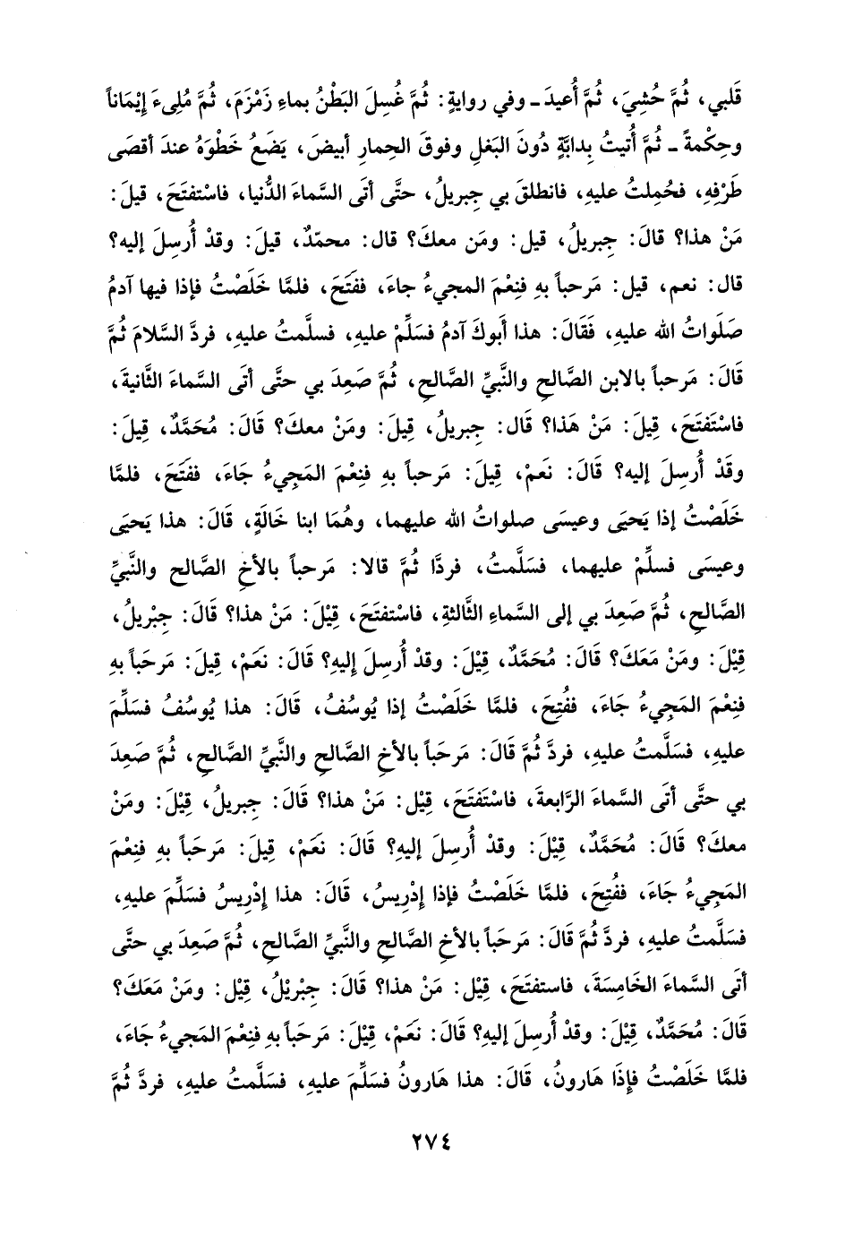 قَلبي، ثُمَّ حُشِيَ، ثُمَّ أُعيدَ - وفي روايةٍ: ثُمَّ غُسِلَ البَطْنُ بماءِ زَمْزَمَ، ثُمَّ مُلِئَ إِيْمَاناً وحِكْمةً - ثُمَّ أُتيتُ بِدابَّةٍ دُونَ البَغلِ وفوقَ الحِمارِ أبيضَ، يَضَعُ خَطْوَهُ عندَ أقصَى طَرْفِهِ، فحُمِلتُ عليهِ، فانطلقَ بي جِبريلُ، حتَّى أتَى السَّماءَ الدُّنيا، فاسْتفتَحَ، قيلَ: مَنْ هذا؟ قالَ: جِبريلُ، قيل: ومَن معكَ؟ قال: محمّدٌ، قيلَ: وقدْ أُرسِلَ إليه؟ قال: نعم، قيل: مَرحباً بهِ فنِعْمَ المجيءُ جاءَ، ففتَحَ، فلمَّا خَلَصْتُ فإذا فيها آدمُ صَلَواتُ الله عليهِ، فَقَالَ: هذا أَبوكَ آدمُ فسَلِّمْ عليهِ، فسلَّمتُ عليهِ، فردَّ السَّلامَ ثُمَّ قَالَ: مَرحباً بالابن الصَّالحِ والنَّبيِّ الصَّالحِ، ثُمَّ صَعِدَ بي حتَّى أتَى السَّماءَ الثَّانيةَ، فاسْتَفتَحَ، قِيلَ: مَنْ هَذا؟ قَال: جِبريلُ، قِيلَ: ومَنْ معكَ؟ قَالَ: مُحَمَّدٌ، قِيلَ: وقَدْ أُرسِلَ إليه؟ قَالَ: نَعمْ، قِيلَ: مَرحباً بهِ فنِعْمَ المَجِيءُ جَاءَ، ففتَحَ، فلمَّا خَلَصْتُ إذا يَحيَى وعيسَى صلواتُ الله عليهما، وهُمَا ابنا خَالَةٍ، قَالَ: هذا يَحيَى وعيسَى فسلِّمْ عليهما، فسَلَّمتُ، فردَّا ثُمَّ قالا: مَرحباً بالأخِ الصَّالح والنَّبيِّ الصَّالحِ، ثُمَّ صَعِدَ بي إلى السَّماءَ الثَّالثةِ، فاسْتفتَحَ، قِيْلَ: مَنْ هذا؟ قَالَ: جِبْريلُ، قِيْلَ: ومَنْ مَعَكَ؟ قَالَ: مُحَمَّدٌ، قِيْلَ: وقدْ أُرسِلَ إِليهِ؟ قَالَ: نعَمْ، قِيلَ: مَرحَباً بهِ فنِعْمَ المَجِيءُ جَاءَ، ففُتِحَ، فلمَّا خَلَصْتُ إذا يُوسُفُ، قَالَ: هذا يُوسُفُ فسَلِّمَ عليهِ، فسَلَّمتُ عليهِ، فردَّ ثُمَّ قَالَ: مَرحَباً بالأخِ الصَّالحِ والنَّبيِّ الصَّالحِ، ثُمَّ صَعِدَ بي حتَّى أتَى السَّماءَ الرَّابعةَ، فاسْتَفتَحَ، قِيْل: مَنْ هذا؟ قَالَ: جِبريلُ، قِيْلَ: ومَنْ معكَ؟ قَالَ: مُحَمَّدٌ، قِيْلَ: وقدْ أُرسِلَ إليهِ؟ قَالَ: نَعَمْ، قِيلَ: مَرحَباً بهِ فنِعْمَ المَجِيءُ جَاءَ، ففُتِحَ، فلمَّا خَلَصْتُ فإذا إدْرِيسُ، قَالَ: هذا إدْرِيسُ فسَلِّمَ عليهِ، فسَلَّمتُ عليهِ، فردَّ ثُمَّ قَالَ: مَرحَباً بالأخِ الصَّالحِ والنَّبيِّ الصَّالحِ، ثُمَّ صَعِدَ بي حتَّى أتَى السَّماءَ الخَامِسَةَ، فاستفتَحَ، قِيْل: مَنْ هذا؟ قَالَ: جِبْريْلُ، قِيْل: ومَنْ مَعَكَ؟ قَالَ: مُحَمَّدٌ، قِيْلَ: وقدْ أُرسِلَ إليهِ؟ قَالَ: نعَمْ، قِيْلَ: مَرحَباً بهِ فنِعْمَ المَجيءُ جَاءَ، فلمَّا خَلَصْتُ فإذَا هَارونُ، قَالَ: هذا هَارونُ فسَلِّمَ عليهِ، فسَلَّمتُ عليهِ، فردَّ ثُمَّ