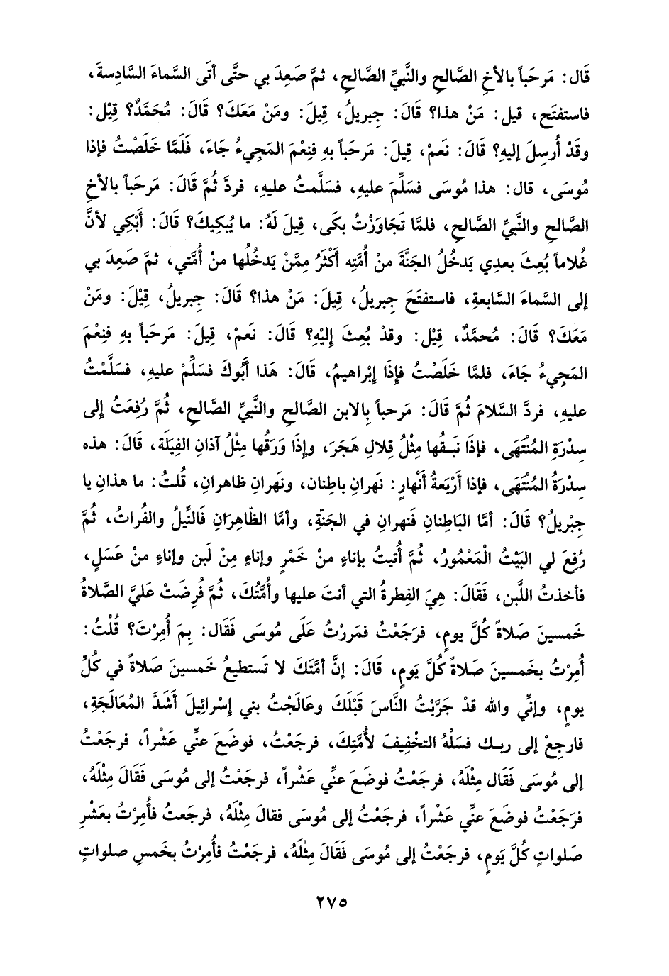 قَال: مَرحَباً بالأخِ الصَّالحِ والنَّبيِّ الصَّالحِ، ثمَّ صَعِدَ بي حتَّى أتَى السَّماءَ السَّادِسةَ، فاستفتَح، قيل: مَنْ هذا؟ قَالَ: جِبريلُ، قِيلَ: ومَنْ مَعَكَ؟ قَالَ: مُحَمَّدٌ؟ قِيْل: وقَدْ أُرسِلَ إليهِ؟ قَالَ: نَعمْ، قِيلَ: مَرحَباً بهِ فنِعْمَ المَجِيءُ جَاءَ، فَلَمَّا خَلَصْتُ فإذا مُوسَى، قال: هذا مُوسَى فسَلِّمَ عليهِ، فسَلَّمتُ عليهِ، فردَّ ثُمَّ قَالَ: مَرحَباً بالأخِ الصَّالحِ والنَّبيِّ الصَّالحِ، فلمَّا تَجَاوَزْتُ بكَى، قِيلَ لَهُ: ما يُبكِيكَ؟ قَالَ: أَبْكِي لأنَّ غُلاماً بُعِثَ بعدِي يَدخُلُ الجَنَّةَ منْ أُمَّتِه أكَثَرُ مِمَّنْ يَدخُلُها منْ أُمَّتي، ثمَّ صَعِدَ بي إلى السَّماءَ السَّابعةِ، فاستفتَحَ جِبريلُ، قِيلَ. مَنْ هذا؟ قَالَ: جِبريلُ، قِيْلَ: ومَن مَعَكَ؟ قَالَ: مُحمَّدٌ، قِيْل: وقدْ بُعِثَ إِليْهِ؟ قَالَ: نَعمْ، قِيلَ: مَرحَباً بهِ فنِعْمَ المَجِيءُ جَاءَ، فلمَّا خَلَصْتُ فإذَا إِبْراهيمُ، قَالَ: هَذا أَبُوكَ فسَلِّمْ عليهِ، فسَلَّمْتُ عليهِ، فردَّ السَّلامَ ثُمَّ قَالَ: مَرحباً بِالابن الصَّالحِ والنَّبيِّ الصَّالحِ، ثُمَّ رُفِعَتُ إلى سِدْرَةِ المُنْتَهَى، فإذَا نبَقُها مِثْلُ قِلالِ هَجَرَ، وإِذَا وَرَقُها مِثْلُ آذانِ الفِيَلَة، قَالَ: هذه سِدْرَةُ المُنْتَهَى، فإذا أَرْبَعةُ أَنْهارٍ: نَهرانِ باطِنان، ونَهرانِ ظاهرانِ، قُلتُ: ما هذانِ يا جِبْريلُ؟ قَالَ: أمَّا البَاطِنانِ فَنهرانِ في الجَنَّةِ، وأمَّا الظّاهِرَانِ فَالنِّيلُ والفُراتُ، ثُمَّ رُفِعَ لي البَيْتُ الْمَعْمُورُ، ثُمَّ أُتيتُ بإناءٍ منْ خَمْرٍ وإناءٍ مِنْ لَبن وإناءٍ منْ عَسَلٍ، فأخذتُ اللَّبن، فَقَالَ: هِيَ الفِطرةُ التي أنتَ عليها وأُمَّتُكَ، ثُمَّ فُرِضَتْ عَليَّ الصَّلاةُ خَمسينَ صَلاةً كُلَّ يومٍ، فرَجَعْتُ فمَررْتُ عَلَى مُوسَى فَقَال: بِمَ أُمِرْتَ؟ قُلْتُ: أُمِرْتُ بخَمسينَ صَلاةً كُلَّ يَومٍ، قَالَ: إنَّ أمَّتَكَ لا تَستطيعُ خَمسينَ صَلاةً في كُلِّ يومٍ، وإنِّي والله قدْ جَرَّبْتُ النَّاسَ قَبْلَكَ وعَالَجْتُ بني إِسْرائِيلَ أَشَدَّ المُعَالَجَةِ، فارجِعْ إلى ربك فسَلْهُ التخْفِيفَ لأُمَّتِكَ، فرجَعْتُ، فوضَعَ عنِّي عَشْراً، فرجَعْتُ إلى مُوسَى فَقَال مِثْلَهُ، فرجَعْتُ فوضَعَ عنِّي عَشْراً، فرجَعْتُ إلى مُوسَى فَقَالَ مِثْلَهُ، فرَجَعْتُ فوضَعَ عنِّي عَشْراً، فرجَعْتُ إلى مُوسَى فقالَ مِثْلَهُ، فرجَعتُ فأُمِرْتُ بعَشْرِ صَلواتٍ كُلَّ يَومٍ، فرجَعْتُ إلى مُوسَى فَقَالَ مِثْلَهُ، فرجَعْتُ فأُمِرْتُ بخَمسِ صلواتٍ