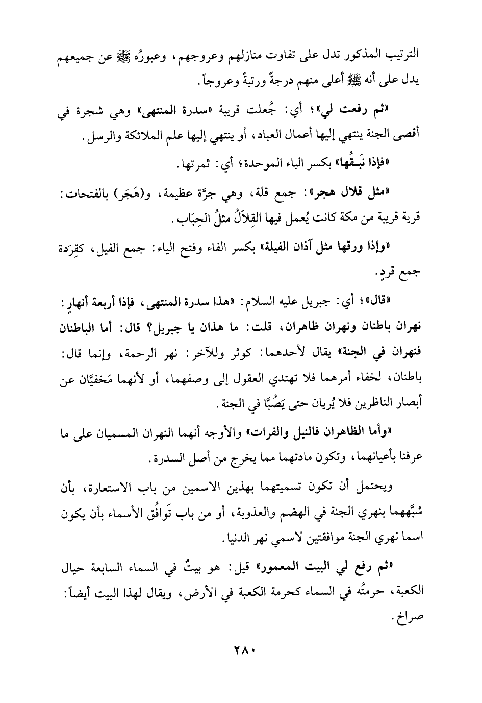 "وأما الظاهران فالنيل والفرات" والأوجه أنهما النهران المسميان على ما عرفنا بأعيانهما، وتكون مادتهما مما يخرج من أصل السدرة.