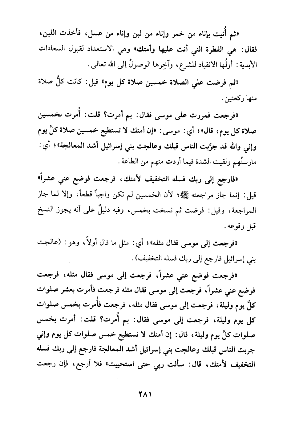 "فرجعت فوضع عني عشراً، فرجعت إلى موسى فقال مثله، فرجعت فوضع عني عشراً، فرجعت إلى موسى فقال مثله فرجعت فأمرت بعشر صلوات كلَّ يوم وليلة، فرجعت إلى موسى فقال مثله، فرجعت فأُمرت بخمس صلوات كل يوم وليلة، فرجعت إلى موسى فقال: بم أُمرت؟ قلت: أمرت بخمس صلوات كلَّ يوم وليلة، قال: إن أمتك لا تستطيع خمس صلوات كل يوم وإني جربت الناس قبلك وعالجت بني إسرائيل أشد المعالجة فارجع إلى ربك فسله التخفيف لأمتك، قال: سألت ربي حتى استحييت" فلا أرجع، فإن رجعت