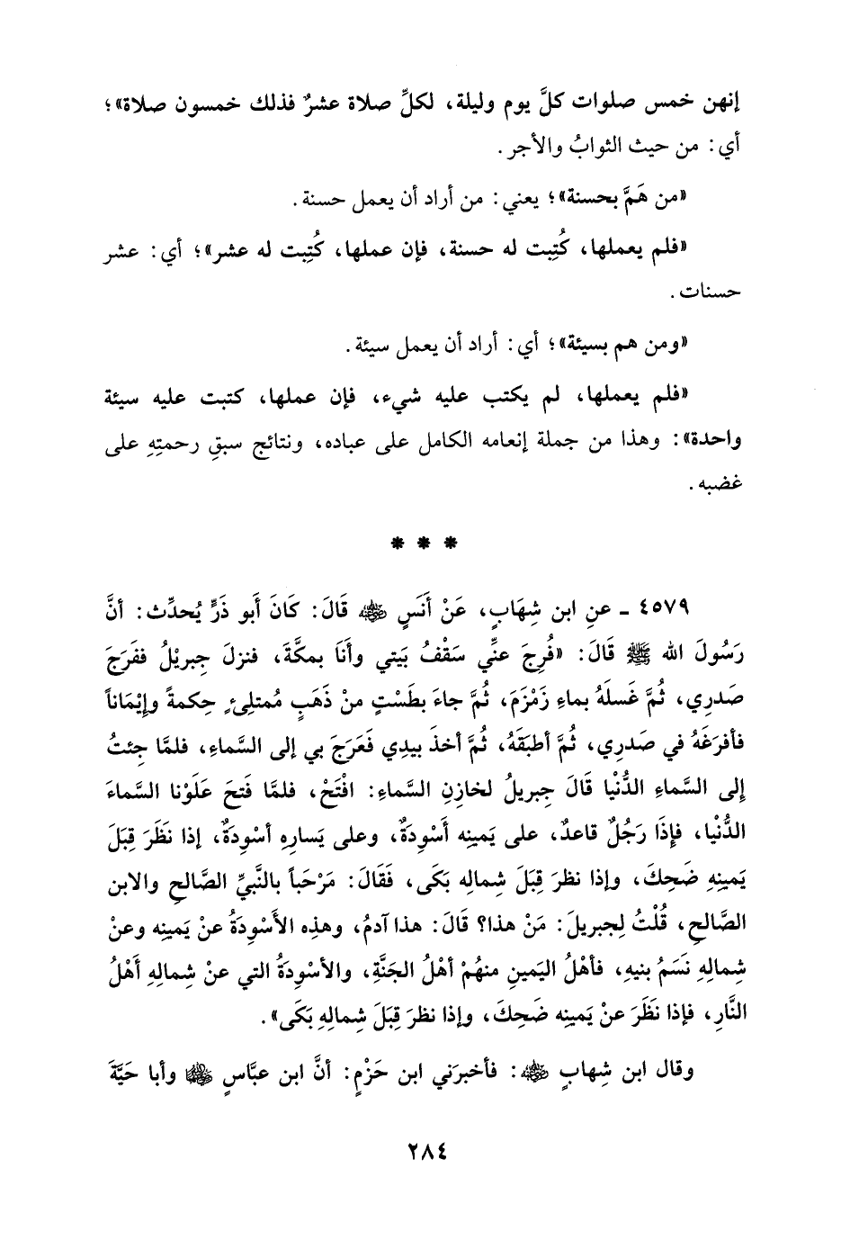 4579 - عنِ ابن شِهَابٍ، عَنْ أَنسٍ - صلى الله عليه وسلم - قَالَ: كَانَ أَبو ذَرٍّ يُحدِّث: أنَّ رَسُولَ الله - صلى الله عليه وسلم - قَالَ: "فُرِجَ عنِّي سَقْفُ بَيتي وأَنَا بمكَّةَ، فنزلَ جِبريْلُ ففَرَجَ صَدرِي، ثُمَّ غَسلَهُ بماءِ زَمْزَمَ، ثُمَّ جاءَ بطَسْتٍ منْ ذَهَبٍ مُمتلِئٍ حِكمةً وإِيْمَاناً فأفرَغَهُ في صَدرِي، ثُمَّ أطبَقَهُ، ثُمَّ أخذَ بيدِي فَعَرَجَ بي إلى السَّماءَ، فلمَّا جِئتُ إِلى السَّماءَ الدُّنْيا قَالَ جِبريلُ لخازِنِ السَّماءَ: افْتَحْ، فلمَّا فَتحَ عَلَوْنا السَّماءَ الدُّنْيا، فإذَا رَجُلٌ قاعدٌ، على يَمينِه أَسْوِدَةٌ، وعلى يَسارِهِ أسْوِدَةٌ، إذا نَظَرَ قِبَلَ يَمينِهِ ضَحِكَ، وإذا نظرَ قِبَلَ شِمالِه بَكَى، فَقَالَ: مَرْحَباً بالنَّبيِّ الصَّالحِ والابن الصَّالح، قُلْتُ لِجبريلَ: مَنْ هذا؟ قَالَ: هذا آدمُ، وهذِه الأَسْوِدَةُ عنْ يَمينِه وعنْ شِمالِهِ نَسَمُ بنيهِ، فأهْلُ اليَمينِ منهُمْ أهْلُ الجَنَّةِ، والأسْوِدَةُ التي عنْ شِمالِهِ أَهْلُ النَّارِ، فإذا نَظَرَ عنْ يَمينِه ضَحِكَ، وإذا نظرَ قِبَلَ شِمالِهِ بَكَى".