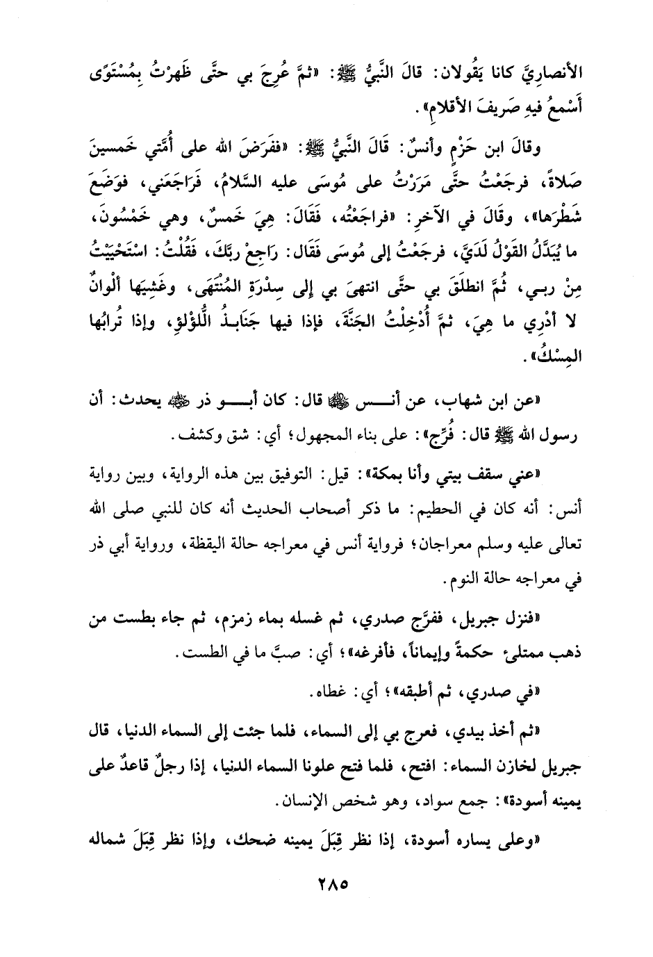 وقالَ ابن حَزْمٍ وأنسٌ: قَالَ النَّبيّ - صلى الله عليه وسلم -: "ففَرَضَ الله على أُمَّتي خَمسينَ صَلاةً، فرجَعْتُ حتَّى مَرَرْتُ على مُوسَى عليه السَّلامُ، فَرَاجَعَني، فوَضَعَ شَطْرَها"، وقَالَ في الآخرِ: "فراجَعْتُه، فَقَالَ: هِيَ خَمسٌ، وهي خَمْسُونَ، ما يُبَدَّلُ القَوْلُ لَدَيَّ، فرجَعْتُ إلى مُوسَى فَقَال: رَاجِعْ ربَّكَ، فَقُلْتُ: اسْتَحْيَيْتُ مِنْ ربي، ثُمَّ انطلَقَ بي حتَّى انتهىَ بي إِلى سِدْرَةِ المُنْتَهَى، وغَشِيَها ألْوانٌ لا أدْرِي ما هِيَ، ثمَّ أُدْخِلْتُ الجَنَّةَ، فإذا فيها جَنَابذُ الُّلؤْلؤِ، وإذا تُرابُها المِسْكُ".