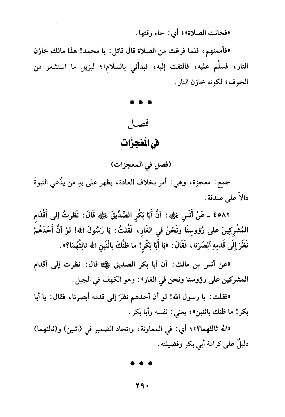 4582 - عَنْ أَنسٍ - رضي الله عنه -: أنَّ أَبَا بَكْرٍ الصِّدِّيقَ - رضي الله عنه - قَالَ: نظَرتُ إلى أَقْدَامِ المُشْرِكِينَ على رُؤوسِنَا ونَحْنُ في الغَارِ، فَقُلتُ: يَا رَسُولَ الله! لوْ أنَّ أَحَدَهُمْ نَظَرَ إِلَى قَدمِهِ أبْصَرَنا، فَقَالَ: "يَا أَبَا بَكْرٍ! ما ظنُّكَ باثْنَينِ الله ثالِثُهُمَا؟ ".