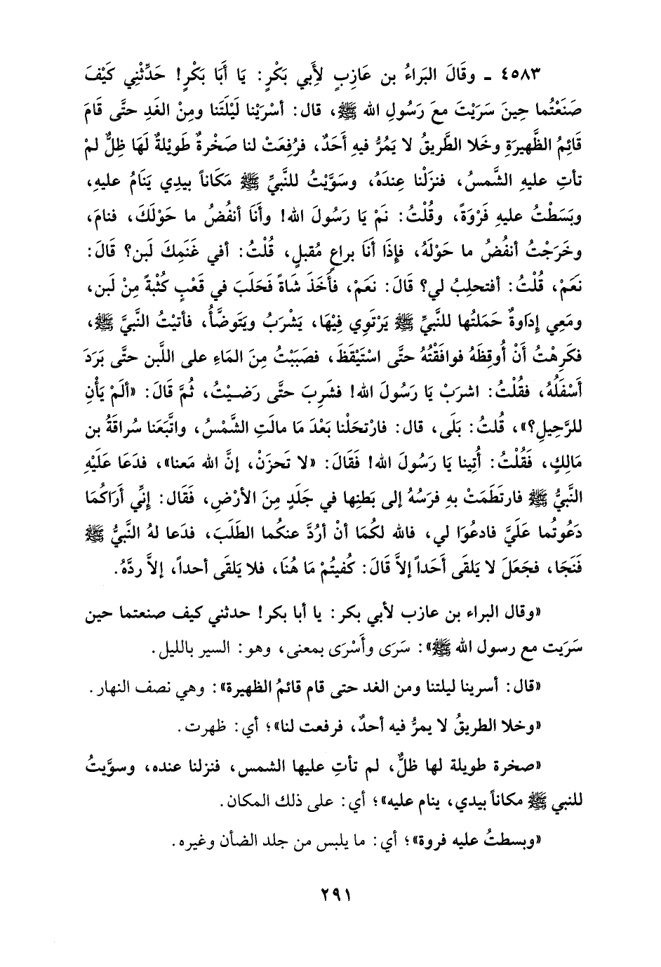 4583 - وقَالَ البَراءُ بن عَازِبٍ لأَبِي بَكْرٍ: يَا أَبَا بَكْرٍ! حَدِّثْنِي كَيْفَ صنَعْتُما حِينَ سَرَيْتَ معَ رَسُولِ الله - صلى الله عليه وسلم -، قال: أسْرَيْنا لَيْلَتَنا ومِنْ الغَدِ حتَّى قَامَ قَائِمُ الظَّهيرَةِ وخَلا الطَّريقُ لا يَمُرُّ فيهِ أَحَدٌ، فرُفِعَتْ لنا صَخْرةٌ طَويْلةٌ لَهَا ظِلٌّ لمْ تأتِ عليهِ الشَّمسُ، فنزَلْنا عِندَهُ، وسَوَّيْتُ للنَّبيِّ - صلى الله عليه وسلم - مَكَاناً بيدِي يَنَامُ عليهِ، وبَسَطْتُ عليهِ فَرْوَةً، وقُلْتُ: نَمْ يَا رَسُولَ الله! وأَنَا أنفُضُ ما حَوْلَكَ، فنامَ، وخَرَجْتُ أنفُضُ ما حَوْلَهُ، فإِذَا أَنَا براعٍ مُقبلٍ، قُلْتُ: أفي غَنَمِكَ لَبن؟ قَالَ: نعَمْ، قُلْتُ: أفتحلِبُ لي؟ قَالَ: نَعَمْ، فأَخَذَ شَاةً فَحَلَبَ في قَعْبٍ كُثْبةً مِنْ لَبن، ومَعِي إِدَاوةٌ حَمَلتُها للنَّبيِّ - صلى الله عليه وسلم - يَرْتَوِي فِيْهَا، يَشْرَبُ ويَتَوضَّأُ، فأتيْتُ النَّبيَّ - صلى الله عليه وسلم -، فكَرِهْتُ أَنْ أُوقِظَهُ فوافَقْتُهُ حتَّى اسْتَيْقَظَ، فصَبَبْتُ مِنَ المَاءِ على اللَّبن حتَّى بَرَدَ أَسْفَلُهُ، فقُلْتُ: اشرَبْ يَا رَسُولَ الله! فشَرِبَ حتَّى رَضيْتُ، ثُمَّ قَالَ: "ألَمْ يَأْنِ للرَّحِيلِ؟ "، قُلتُ: بَلَى، قال: فارْتحَلْنا بَعْدَ مَا مالَتِ الشَّمْسُ، واتَّبَعَنا سُراقَةُ بن مَالِكٍ، فَقُلْتُ: أُتِينا يَا رَسُولَ الله! فَقَالَ: "لا تَحزَنْ، إنَّ الله مَعنا"، فدَعَا عَلَيْهِ النَّبيُّ - صلى الله عليه وسلم - فارتَطَمَتْ بهِ فرَسُهُ إلى بَطنِها في جَلَدٍ مِنَ الأرْضِ، فَقَال: إِنِّي أَرَاكُمَا دَعُوْتُما عَلَيَّ فادعُوَا لي، فالله لكُمَا أنْ أرُدَّ عنكُما الطَلَبَ، فدَعا لهُ النَّبيُّ - صلى الله عليه وسلم - فَنَجَا، فجَعَلَ لا يَلقَى أَحَداً إلَّا قَالَ: كُفيتُمْ مَا هُنَا، فلا يَلقَى أحداً، إلَّا ردَّهُ.