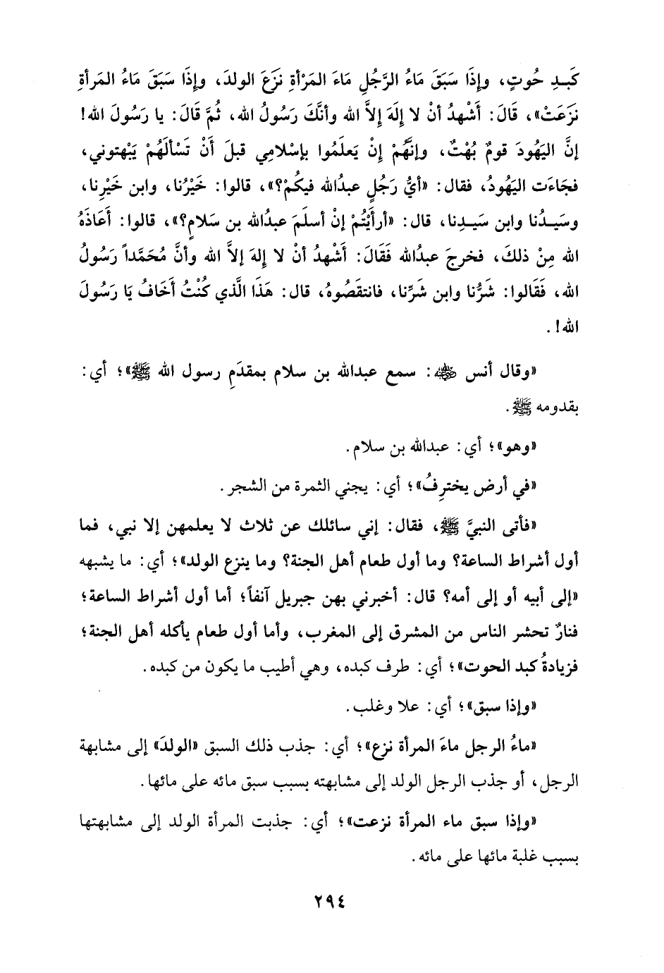 كَبدِ حُوتٍ، وإِذَا سَبَقَ مَاءُ الرَّجُلِ مَاءَ المَرْأةِ نزَعَ الولدَ، وإِذَا سَبَقَ مَاءُ المَرأةِ نزَعَتْ"، قَالَ: أَشْهدُ أنْ لا إِلَهَ إِلاَّ الله وأنَّكَ رَسُولُ الله، ثُمَّ قَالَ: يا رَسُولَ الله! إنَّ اليَهُودَ قومٌ بُهْتٌ، وإنَّهُمْ إِنْ يَعلَمُوا بإسْلامِي قبلَ أَنْ تَسْألَهُمْ يَبْهتوني، فجَاءَت اليَهُودُ، فقال: "أيُّ رَجُلٍ عبدُ الله فيكُمْ؟ "، قالوا: خَيْرُنا، وابن خَيْرِنا، وسَيدُنا وابن سَيدِنا، قال: "أرأَيْتُمْ إنْ أسلَمَ عبدُ الله بن سَلامٍ؟ "، قالوا: أَعَاذَهُ الله مِنْ ذلكَ، فخرجَ عبدُ الله فَقَالَ: أَشْهدُ أنْ لا إِلهَ إلَّا الله وأنَّ مُحَمَّداً رَسُولُ الله، فَقَالوا: شَرُّنا وابن شَرِّنا، فانتقَصُوهُ، قال: هَذَا الَّذي كُنْتُ أَخَافُ يَا رَسُولَ الله!.