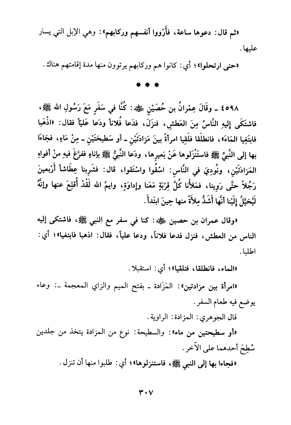 4598 - وقَالَ عِمْرانُ بن حُصَيْنٍ - رضي الله عنه -: كُنَّا في سَفَرٍ مَعَ رَسُولِ الله - صلى الله عليه وسلم -، فاشتَكَى إليهِ النَّاسُ مِنَ العَطشِ، فنزَلَ، فدَعا فُلاناً ودَعا عَليًّا فقال: "اذْهَبا فابتَغِيا المَاءَ"، فانطلَقا فلَقِيا امرأةً بينَ مَزادَتَيْنِ - أو سَطيحَتَيْنِ - مِنْ مَاءٍ، فجَاءَا بها إلى النَّبيِّ - صلى الله عليه وسلم - فاستَنْزَلوها عَنْ بَعيرِها، ودَعا النَّبيّ - صلى الله عليه وسلم - بإناءٍ ففرَّغَ فيهِ منْ أفواهِ المَزادَتَيْنِ، ونُودِيَ في النَّاسِ: اسْقُوا واسْتَقوا، قال: فشَرِبنا عِطَاشاً أَرْبعينَ رَجُلاً حتَّى رَوِينا، فمَلأْنا كُلَّ قِرْبَةٍ مَعَنا وإِداوَةٍ، وايمُ الله لَقْدْ أُقلِعَ عنها وإنَّهُ لَيُخيَّلُ إلَيْنا أنَّها أَشَدُّ مِلأَةً منها حِينَ ابتَدأَ.