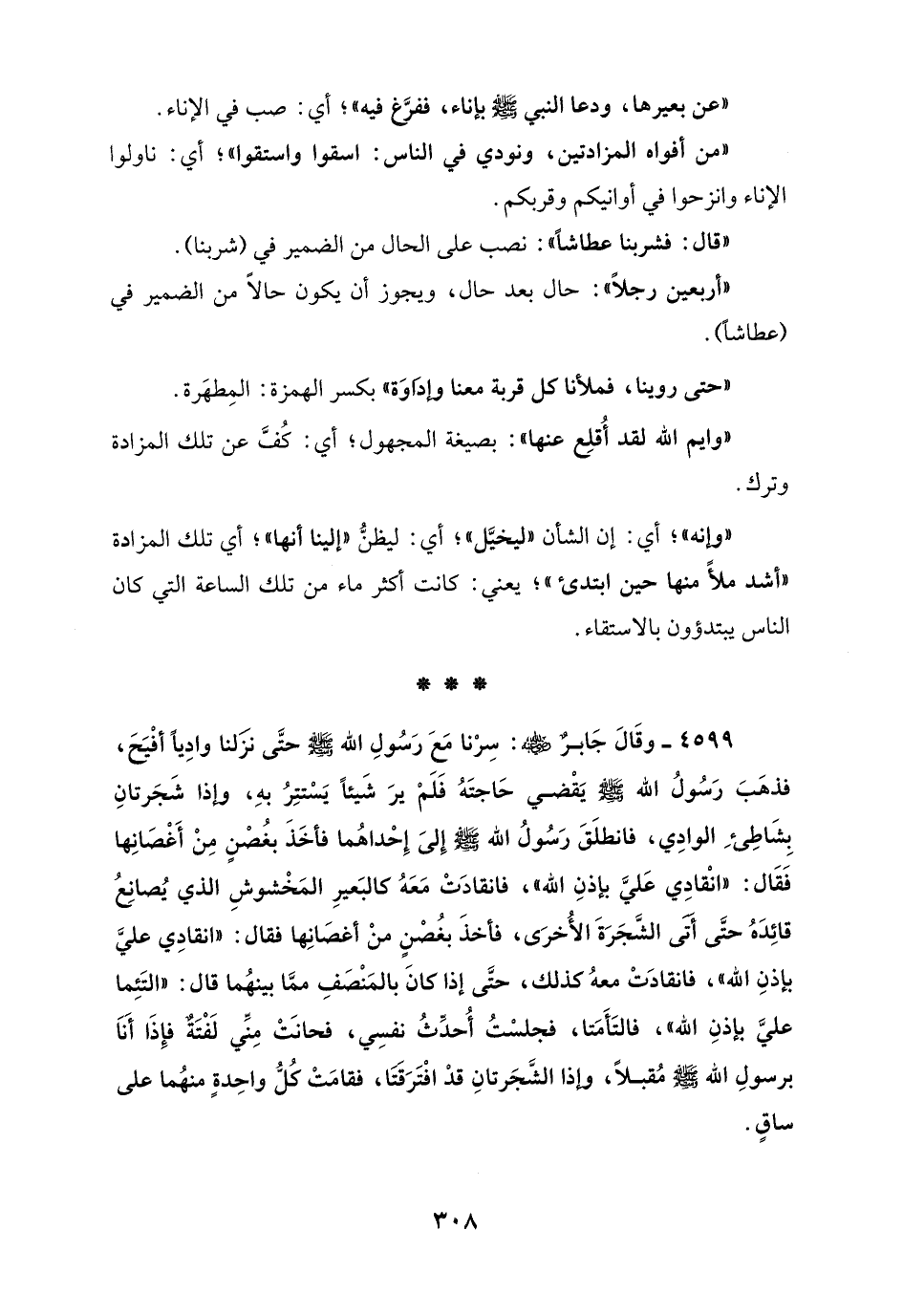 4599 - وقَالَ جَابرٌ - صلى الله عليه وسلم -: سِرْنا مَعَ رَسُولِ الله - صلى الله عليه وسلم - حتَّى نَزَلنا وادِياً أفْيَحَ، فذهَبَ رَسُولُ الله - صلى الله عليه وسلم - يَقْضي حَاجتَهُ فَلَمْ يرَ شَيئاً يَسْتتِرُ بهِ، وإذا شَجَرتانِ بِشَاطِئِ الوادِي، فانطلَقَ رَسُولُ الله - صلى الله عليه وسلم - إِلىَ إِحْداهُما فأخَذَ بغُصْنٍ مِنْ أَغْصَانِها فَقَال: "انْقادِي عَليَّ بإذنِ الله"، فانقادَتْ مَعَهُ كالبَعيرِ المَخْشوشِ الذي يُصانِعُ قائِدَهُ حتَّى أَتَى الشَّجَرَةَ الأُخرَى، فأخذَ بغُصْنٍ منْ أغصَانِها فقال: "انقادِي عليَّ بإذنِ الله"، فانقادَتْ معهُ كذلك، حتَّى إذا كانَ بالمَنْصَفِ ممَّا بينهُما قال: "التَئِما عليَّ بإذنِ الله"، فالتَأَمَتا، فجلسْتُ أُحدِّثُ نفسِي، فحانَتْ مِنِّي لَفْتَةٌ فإِذَا أنَا برسولِ الله - صلى الله عليه وسلم - مُقبلاً، وإذا الشَّجَرتانِ قدْ افْتَرَقَتَا، فقامَتْ كُلُّ واحِدةٍ منهُما على ساقٍ.