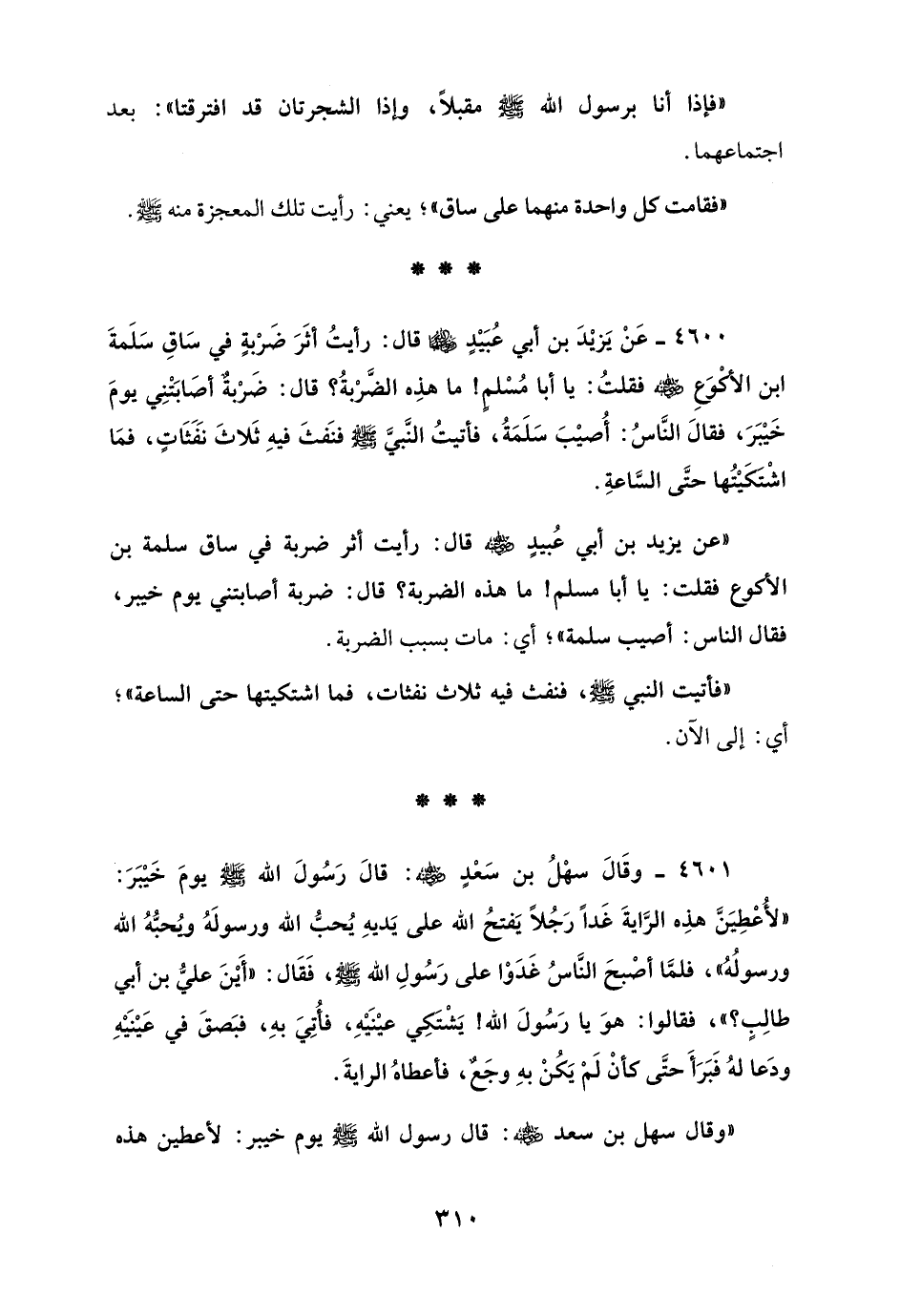 4600 - عَنْ يَزيْدَ بن أبي عُبَيْدٍ - رضي الله عنه - قال: رأيتُ أثَرَ ضَرْبةٍ في سَاقِ سَلَمةَ ابن الأكْوَعِ - رضي الله عنه - فقلتُ: يا أبا مُسْلمٍ! ما هذِه الضَّرْبةُ؟ قال: ضَرْبةٌ أصَابَتْنِي يومَ خَيْبَرَ، فقالَ النَّاسُ: أُصيْبَ سَلَمَةُ، فأتيتُ النَّبيَّ - صلى الله عليه وسلم - فنَفثَ فيهِ ثَلاثَ نَفَثَاتٍ، فمَا اشْتكَيْتُها حتَّى السَّاعةِ.