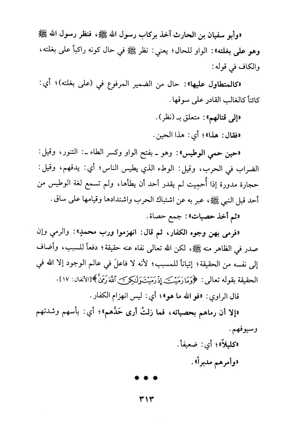 "فرمى بهن وجوه الكفار، ثم قال: انهزموا ورب محمدٍ": والرمي وإن صدر في الظاهر منه - صلى الله عليه وسلم -، لكن الله تعالى نفاه عنه حقيقة؛ دفعاً للسبب، وأضاف إلى نفسه من الحقيقة، إتياناً للمسبب؛ لأنه لا فاعلَ في عالم الوجود إلا الله في الحقيقة بقوله تعالى: {وَمَا رَمَيْتَ إِذْ رَمَيْتَ وَلَكِنَّ اللَّهَ رَمَى} [الأنفال: 17].