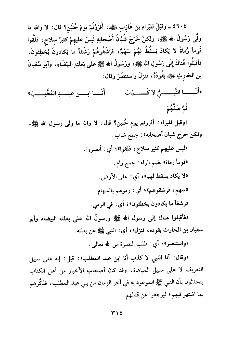 4604 - وقِيْلَ للبَراءِ بن عَازِبٍ - رضي الله عنه -: أفَرَرْتُمْ يومَ حُنَيْنٍ؟ قال: لا والله ما ولَّى رَسُولُ الله - صلى الله عليه وسلم -، ولكنَّ خَرَجَ شُبَّانُ أَصْحابهِ لَيسَ عليهِمْ كثيرُ سِلاحٍ، فلَقُوا قَوماً رُماةً لا يَكادُ يَسقُطُ لهُمْ سَهْمٌ، فرَشَقُوهُمْ رَشْقاً ما يَكادونَ يُخطِئونَ، فأقبَلُوا هُناكَ إِلَى رَسُولِ الله - صلى الله عليه وسلم -، ورَسُولُ الله - صلى الله عليه وسلم - على بَغلتِهِ البَيْضَاءِ، وأبو سُفيانَ بن الحَارِثِ - رضي الله عنه - يَقُودُهُ، فنزلَ واستنصَرَ وقال: