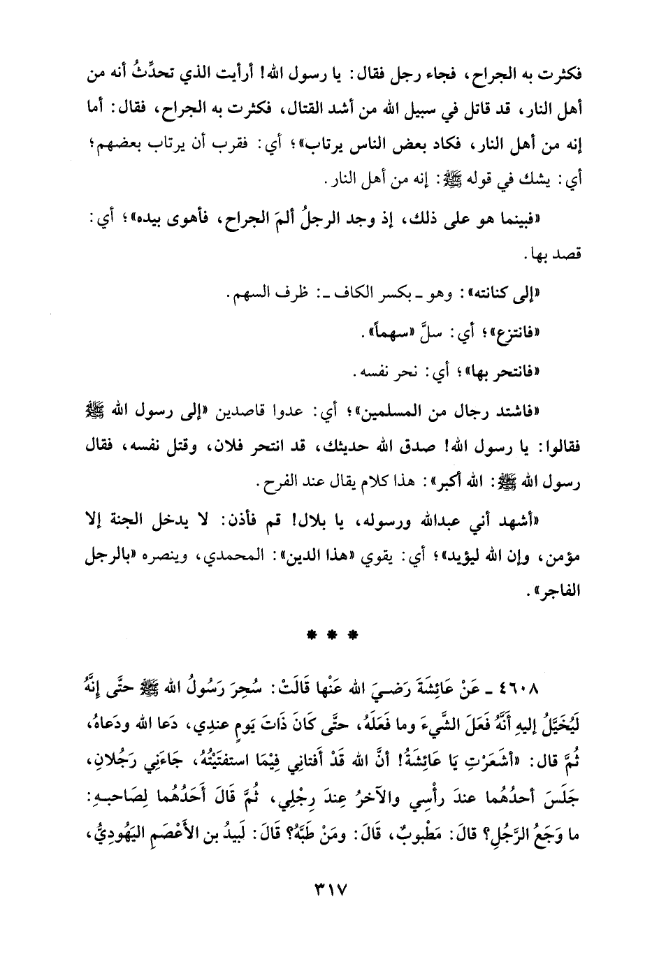 4608 - عَنْ عَائِشَةَ رَضيَ الله عَنْها قَالَتْ: سُحِرَ رَسُولُ الله - صلى الله عليه وسلم - حتَّى إِنَّهُ لَيُخَيَّلُ إليهِ أَنَّهُ فَعَلَ الشَّيءَ وما فَعَلَهُ، حتَّى كَانَ ذَاتَ يَومٍ عندِي، دَعا الله ودَعاهُ، ثُمَّ قال: "أشَعَرْتِ يَا عَائِشَةُ! أنَّ الله قَدْ أَفتانِي فِيْمَا استفتَيْتُهُ، جَاءَنِي رَجُلانِ، جَلَسَ أحدُهُما عندَ رأْسِي والآخرُ عِندَ رِجْلِي، ثُمَّ قَالَ أَحَدُهُما لِصَاحبهِ: ما وَجَعُ الرَّجُلِ؟ قالَ: مَطْبوبٌ، قَالَ: ومَنْ طَبَّهُ؟ قَالَ: لَبيدُ بن الأَعْصَمِ اليَهُودِيُّ،