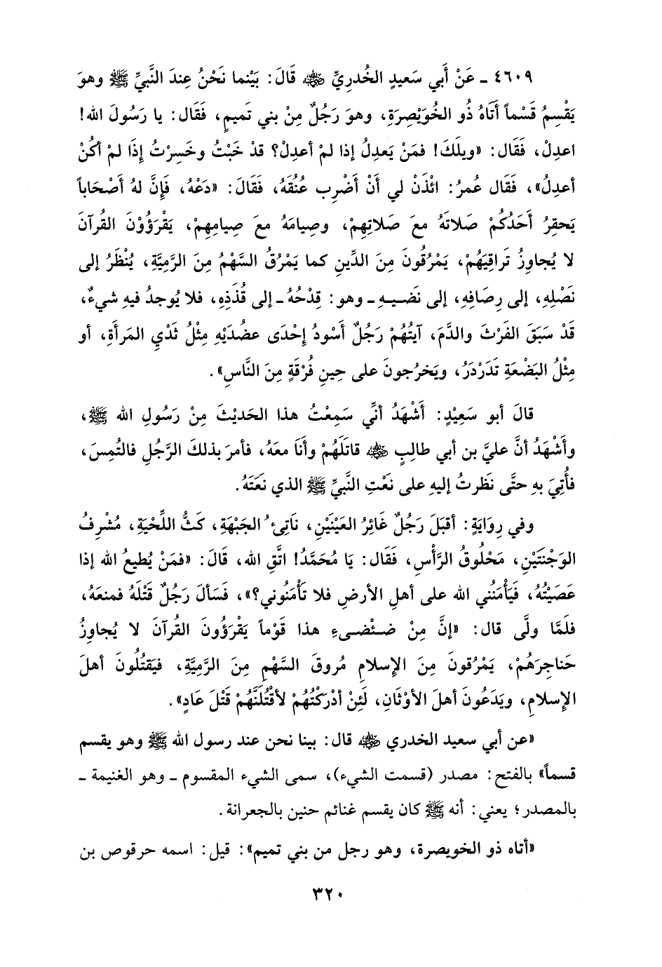 4609 - عَنْ أَبي سَعيدٍ الخُدرِيِّ - رضي الله عنه - قَالَ: بَيْنما نَحْنُ عِندَ النَّبيِّ - صلى الله عليه وسلم - وهوَ يَقْسِمُ قَسْماً أَتَاهُ ذُو الخُوَيْصِرَةِ، وهوَ رَجُلٌ مِنْ بني تَميمٍ، فَقَال: يا رَسُولَ الله! اعدِلْ، فَقَال: "ويلَكَ! فمَنْ يَعدِلُ إذا لمْ أعدِلْ؟ قدْ خَبْتُ وخَسِرْتُ إِذَا لمْ أكُنْ أعدِلُ"، فَقَال عُمرُ: ائْذَنْ لي أَنْ أَضْرِب عُنُقَهُ، فَقَالَ: "دَعْهُ، فَإِنَّ لهُ أَصْحَاباً يَحقِرُ أَحَدُكُمْ صَلاتَهُ معَ صَلاتِهِمْ، وصِيامَهُ معَ صِيامِهِمْ، يَقْرَؤُوْنَ القُرآنَ لا يُجاوِزُ تَراقِيَهُمْ، يَمْرُقُونَ مِنَ الدِّينِ كما يَمْرُقُ السَّهْمُ مِنَ الرَّمِيَّةِ، يُنْظَرُ إلى نَصْلِهِ، إلى رِصَافِهِ، إلى نَضيهِ - وهو: قِدْحُهُ - إلى قُذَذِهِ، فلا يُوجدُ فيهِ شيءٌ، قَدْ سَبَقَ الفَرْثَ والدَّمَ، آيتُهُمْ رَجُلٌ أَسْودُ إِحْدَى عضُدَيْهِ مِثْلُ ثَدْيِ المَرأَةِ، أو مِثْلُ البَضْعَةِ تَدَرْدَرُ، ويَخرُجونَ على حِينِ فُرْقَةٍ مِنَ النَّاسِ".