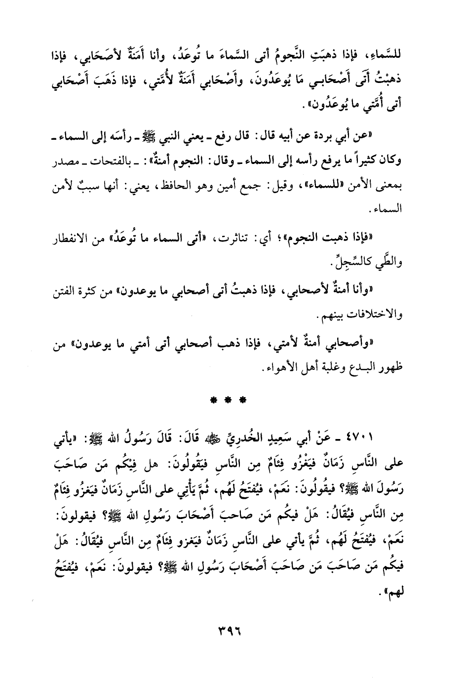 للسَّماءَ، فإذا ذهبَتِ النَّجومُ أتى السَّماءَ ما تُوعَدُ، وأنا أَمَنةٌ لأصَحابي، فإذا ذهبْتُ أتى أَصحابي ما يُوعَدُونَ، وأَصحابي أَمَنةٌ لأُمَتي، فإذا ذَهَبَ أَصحابي أتى أُمَّتي ما يُوعَدُون".