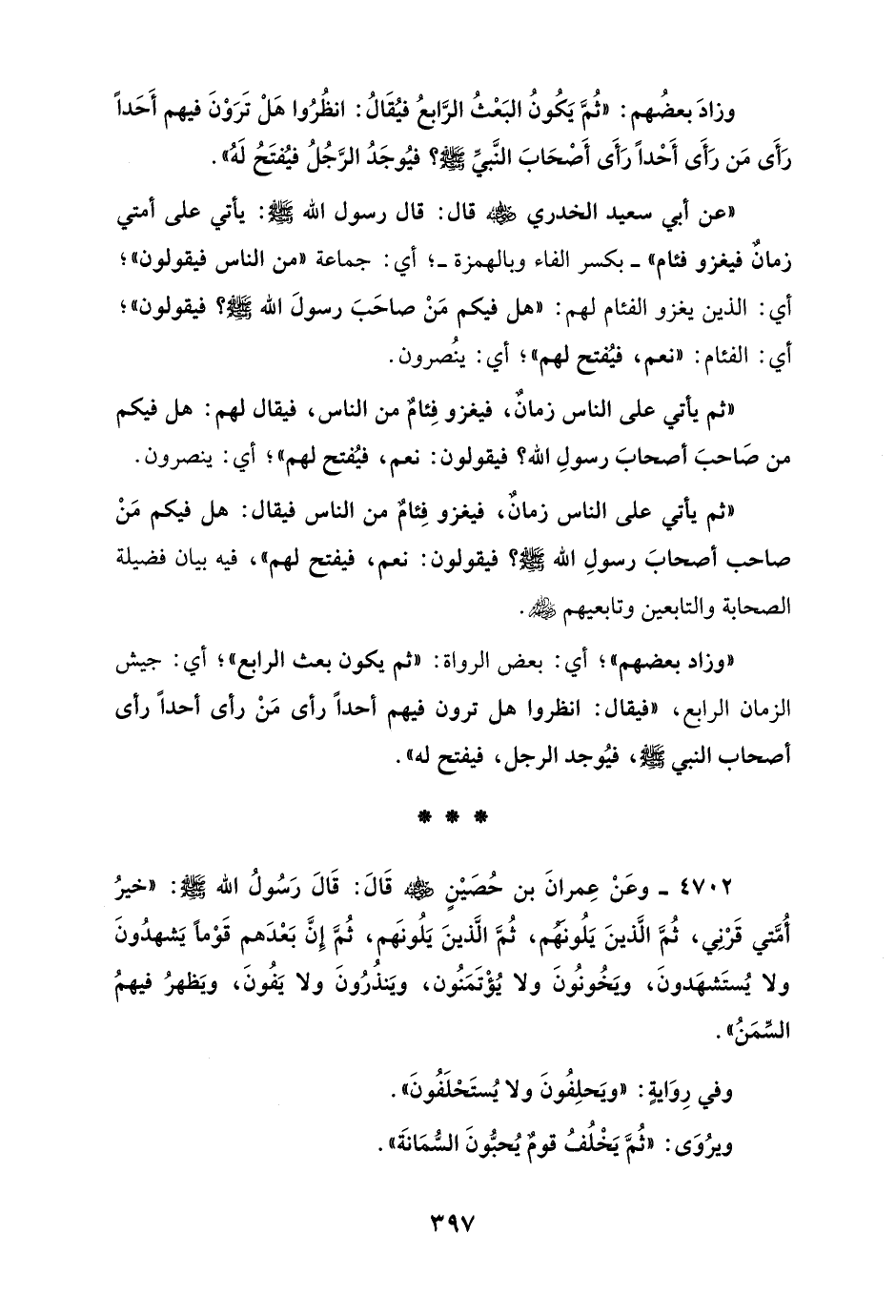 4702 - وعَنْ عِمرانَ بن حُصَيْنٍ - رضي الله عنه - قَالَ: قَالَ رَسُولُ الله - صلى الله عليه وسلم -: "خيرُ أُمَّتي قَرني، ثُمَّ الَّذينَ يَلُونهم، ثُمَّ الَّذينَ يَلُونَهم، ثُمَّ إِنَّ بَعْدَهم قَوْمًا يَشهدُونَ ولا يُستَشهَدونَ، ويَخُونُونَ ولا يُؤْتَمَنُون، ويَنذُرُونَ ولا يَفُونَ، ويَظهرُ فيهمُ السّمَنُ".
