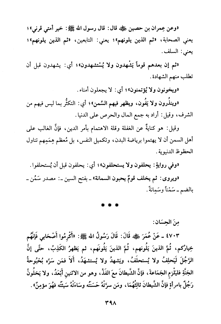 4703 - عَنْ عُمَرَ - رضي الله عنه - قَالَ: قَالَ رَسُولُ الله - صلى الله عليه وسلم -: "أكرِمُوا أَصحابي فَإنّهم خِيارُكم، ثُمَّ الذينَ يَلُونهم، ثُمَّ الذينَ يَلُونَهم، ثمَّ يَظهرُ الكَذِبُ، حتَّى إنَّ الرَّجُلَ لَيَحلِفُ ولا يُستحلَفُ، ويَشهدُ ولا يُستشهَدُ، أَلا فمَن سَرَّه بُحبُوحةُ الجَنَّةِ فليَلْزمِ الجَماعةَ، فإنَّ الشَّيطانَ معَ الفَذِّ، وهو من الاثنينِ أَبْعَدُ، ولا يَخلُونَّ رَجُلٌ بامرأةٍ فإن الشَّيطانَ ثالِثُهُما، ومَن سرَّتْهُ حَسَنته وساءَتْهُ سَيئته فهُوَ مؤمِنٌ".