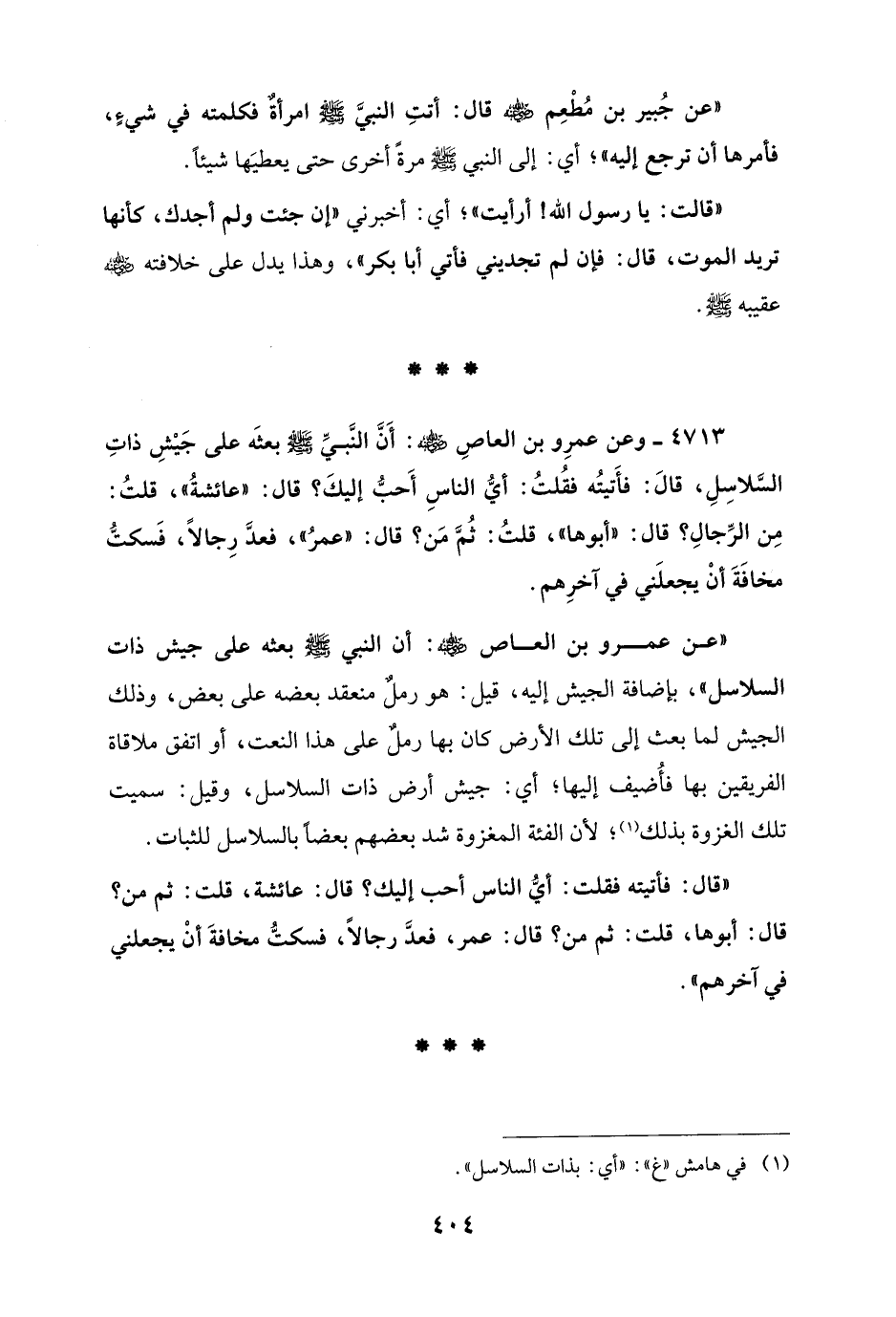 4713 - وعن عمرِو بن العاصِ - رضي الله عنه -: أَنَّ النَّبيَّ - صلى الله عليه وسلم - بعثَه على جَيْشِ ذاتِ السَّلاسِلِ، قَالَ: فأَتيتُه فقُلتُ: أيُّ الناسِ أَحبُّ إليكَ؟ قال: "عائشةُ"، قلتُ: مِن الرِّجالِ؟ قال: "أبوها"، قلتُ: ثُمَّ مَن؟ قال: "عمرُ"، فعدَّ رِجالًا، فَسكتُّ مخافَةَ أنْ يجعلَني في آخرِهم.