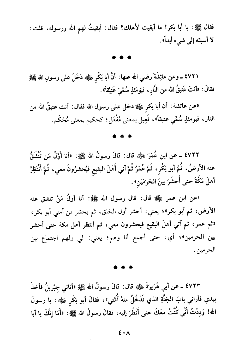 4723 - عن أبي هُرَيرَةَ - رضي الله عنه - قال: قَالَ رسولُ الله - صلى الله عليه وسلم - "أتاني جِبْريلُ فأخذَ بيدي فأراني بابَ الجَنَّةِ الذي تَدْخُلُ منهُ أُمَّتي"، فقالَ أبو بَكْرٍ - رضي الله عنه -: يا رسولَ الله! وَدِدتُ أَنِّي كُنْتُ معَكَ حتى أَنظُرَ إليه، فقالَ رسولُ الله - صلى الله عليه وسلم -: "أَما إِنَّكَ يا أبا