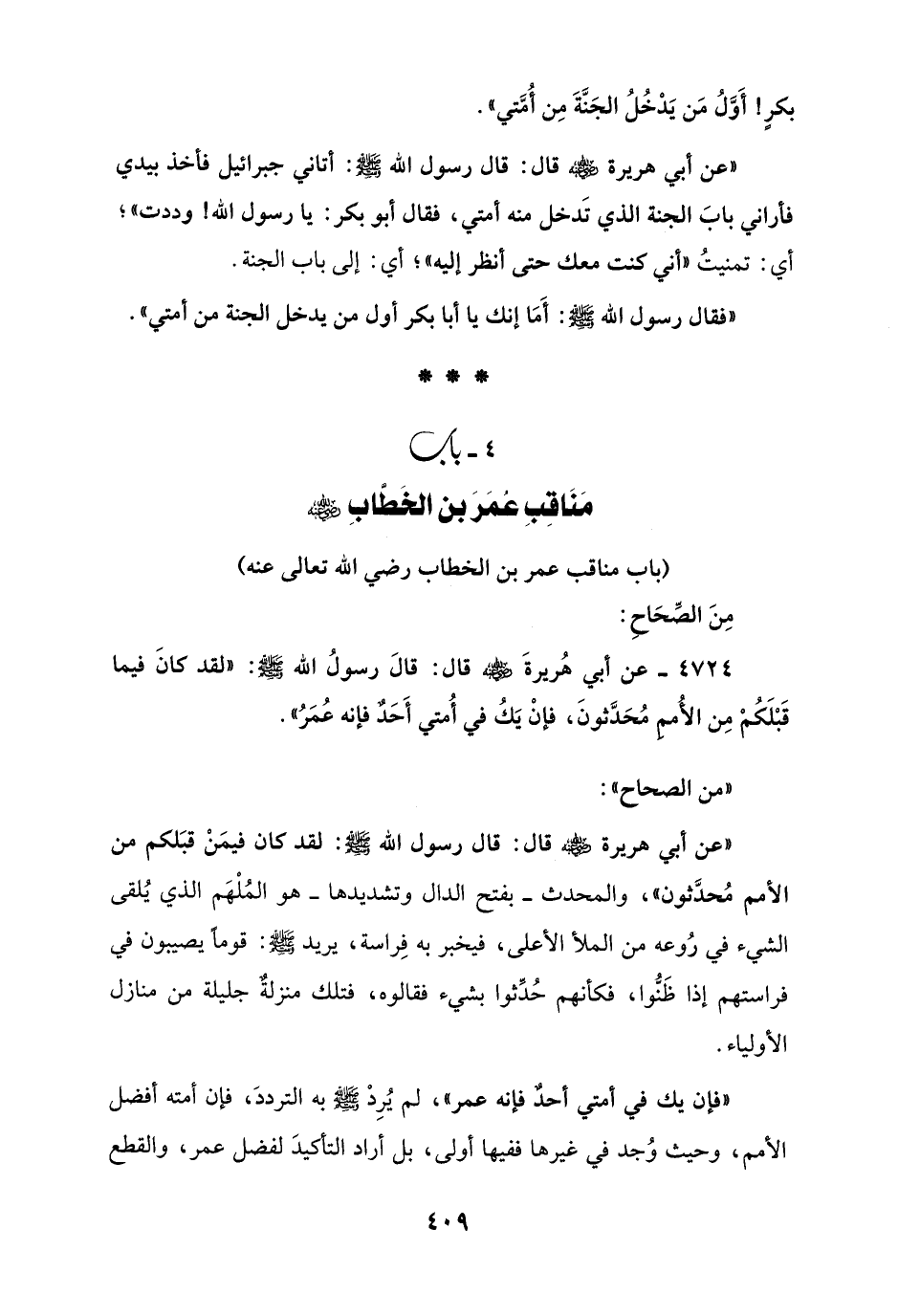 4724 - عن أبي هُريرةَ - رضي الله عنه - قال: قَالَ رسولُ الله - صلى الله عليه وسلم -: "لقد كانَ فيما قَبْلَكُمْ مِن الأُمم مُحَدَّثونَ، فإنْ يَكُ في أُمتي أَحدٌ فإنَّه عُمَرُ".